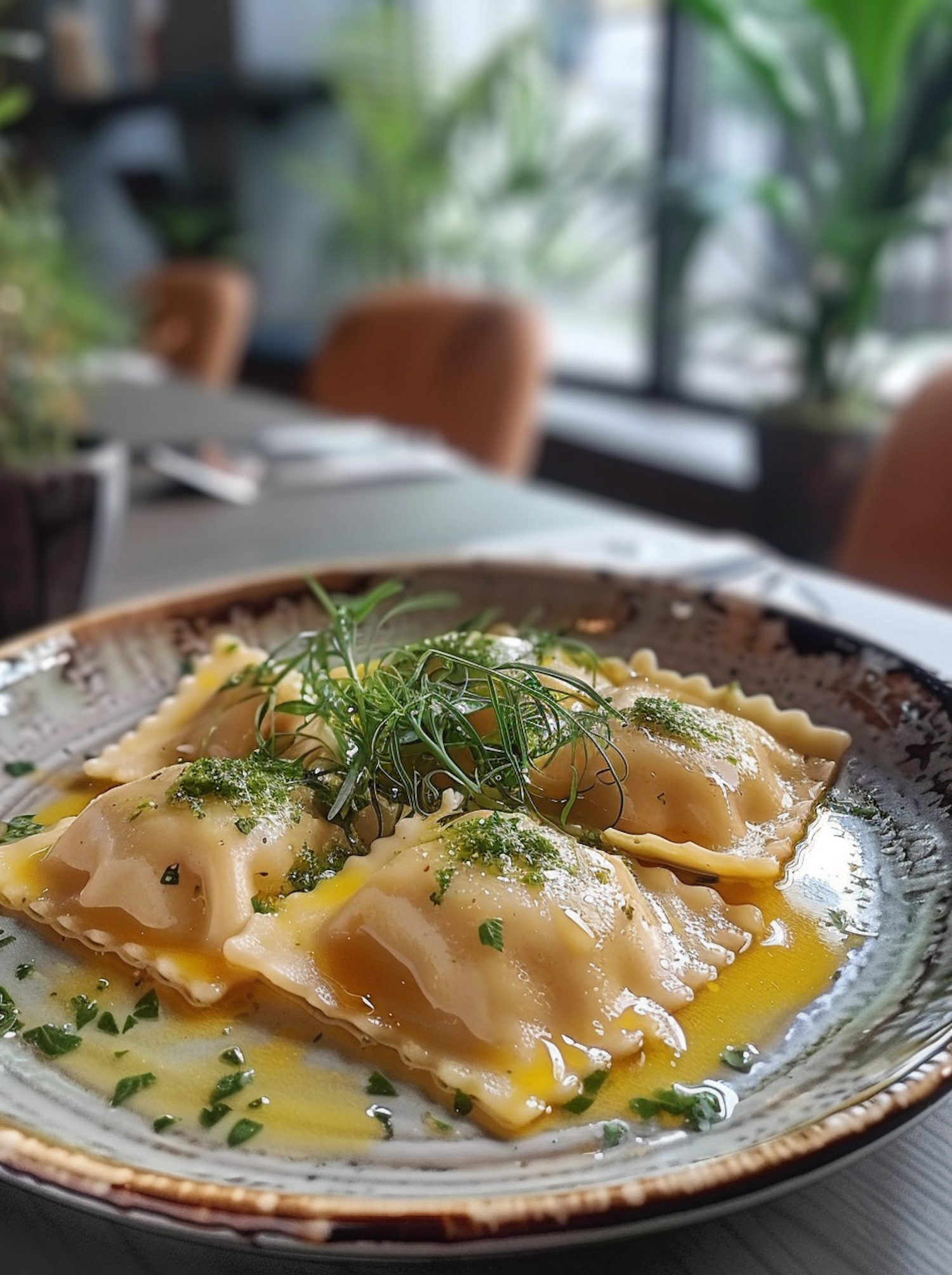 Delicious ravioli in butter sauce with herbs and dill on a rustic plate, set in a cozy dining ambiance.