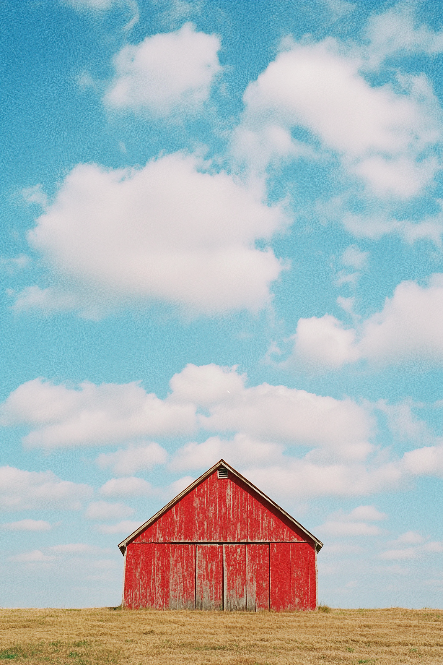 A rustic red barn sits in a golden field under a bright blue sky with fluffy clouds, creating a serene countryside vibe.