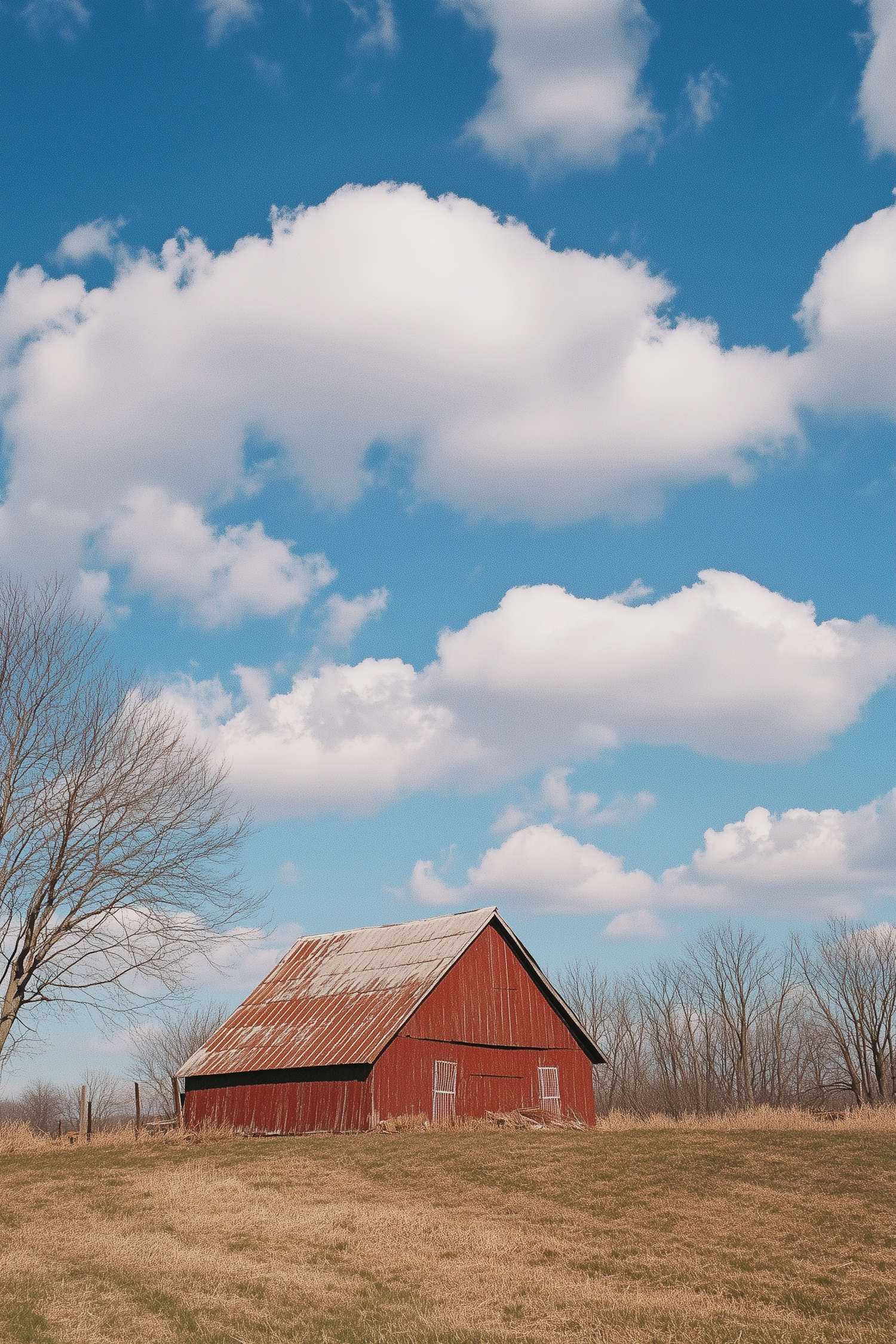 A charming red barn on a grassy hill under a bright blue sky with fluffy clouds, surrounded by bare trees and dry grass.