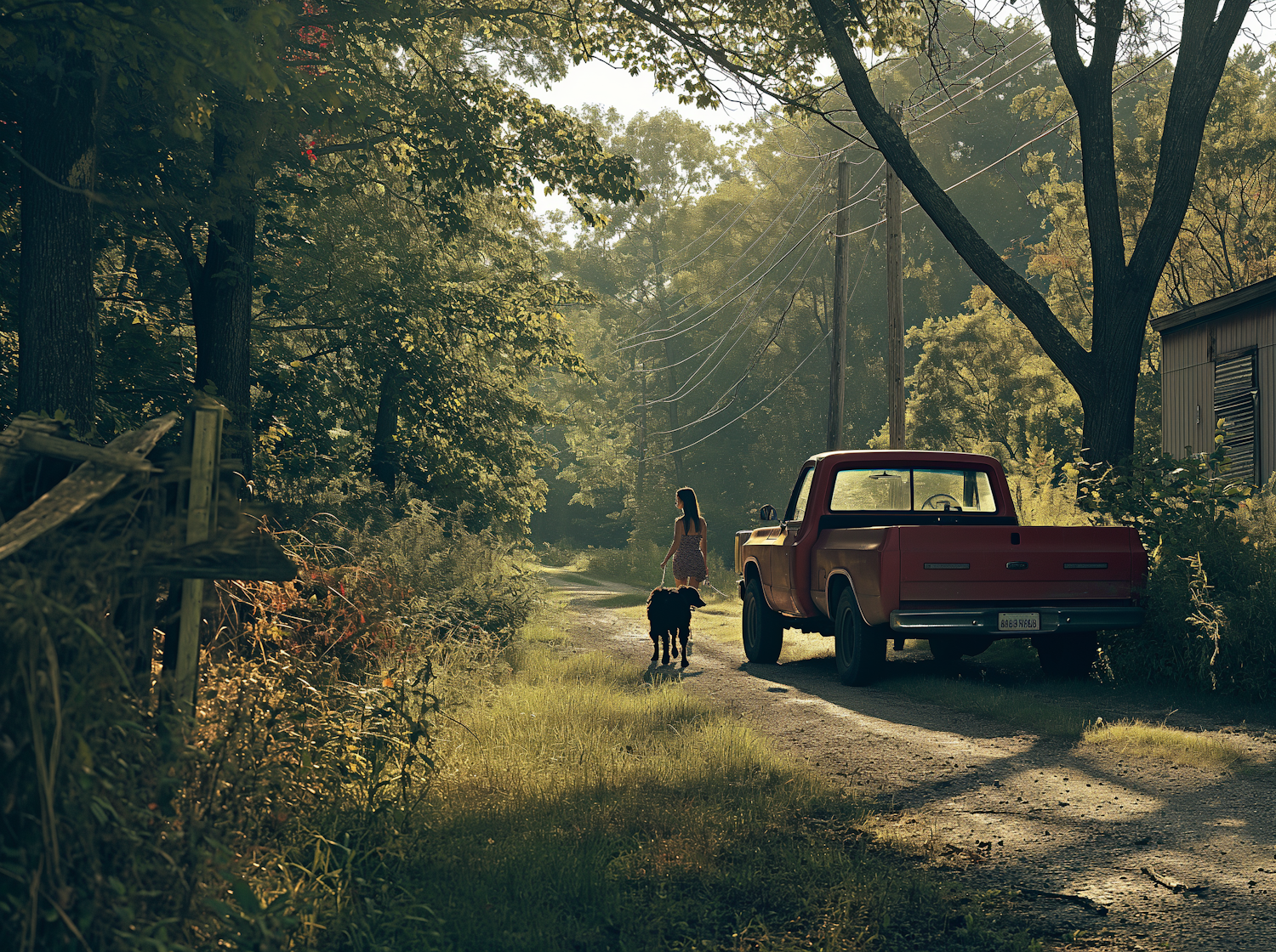 A woman walks a dog near a red pickup truck on a sunlit rural road, surrounded by lush greenery and trees.