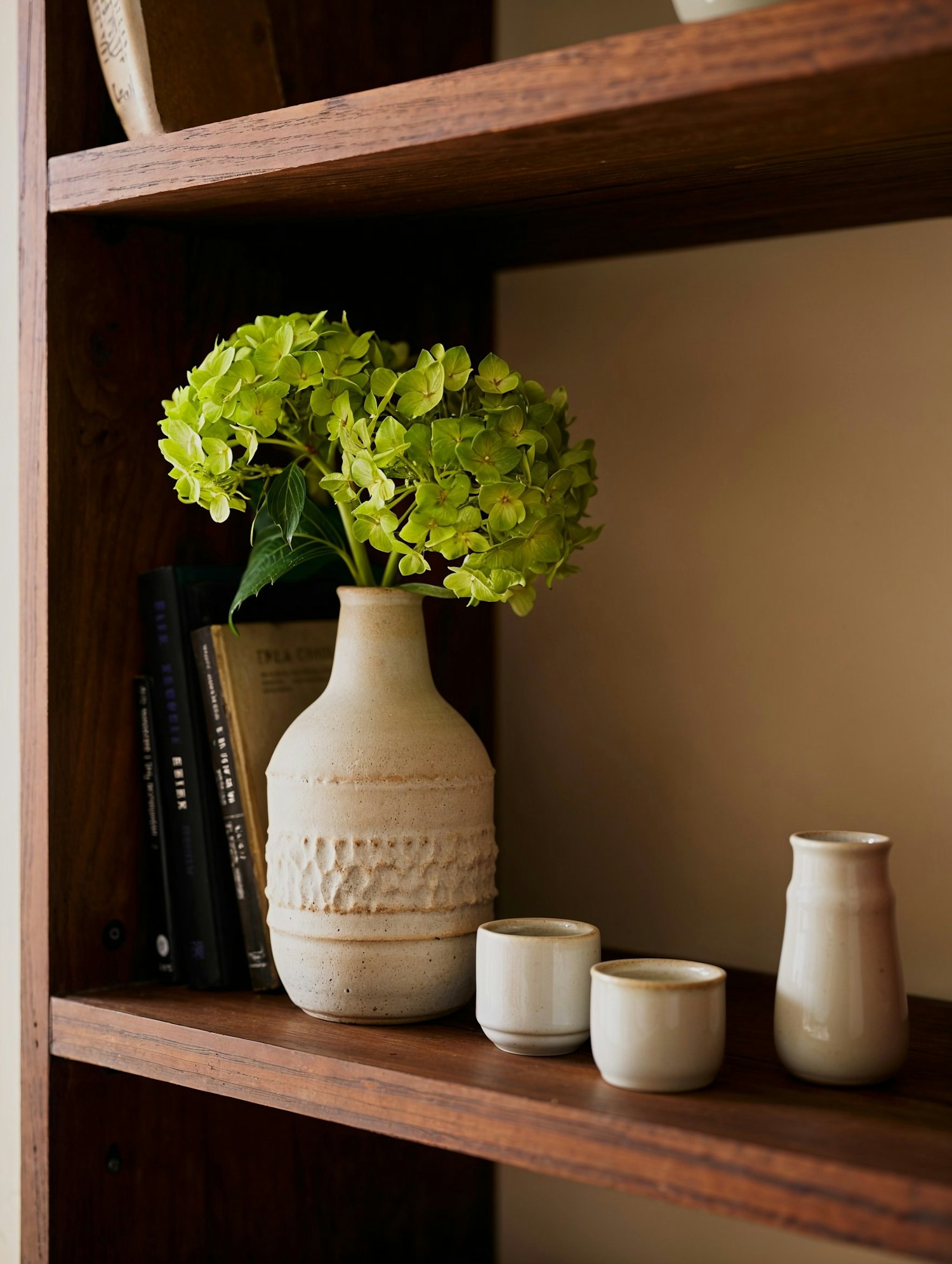 Rustic wooden shelf with a ceramic vase of green hydrangeas, small cups, a pitcher, and books, creating a cozy and natural aesthetic.