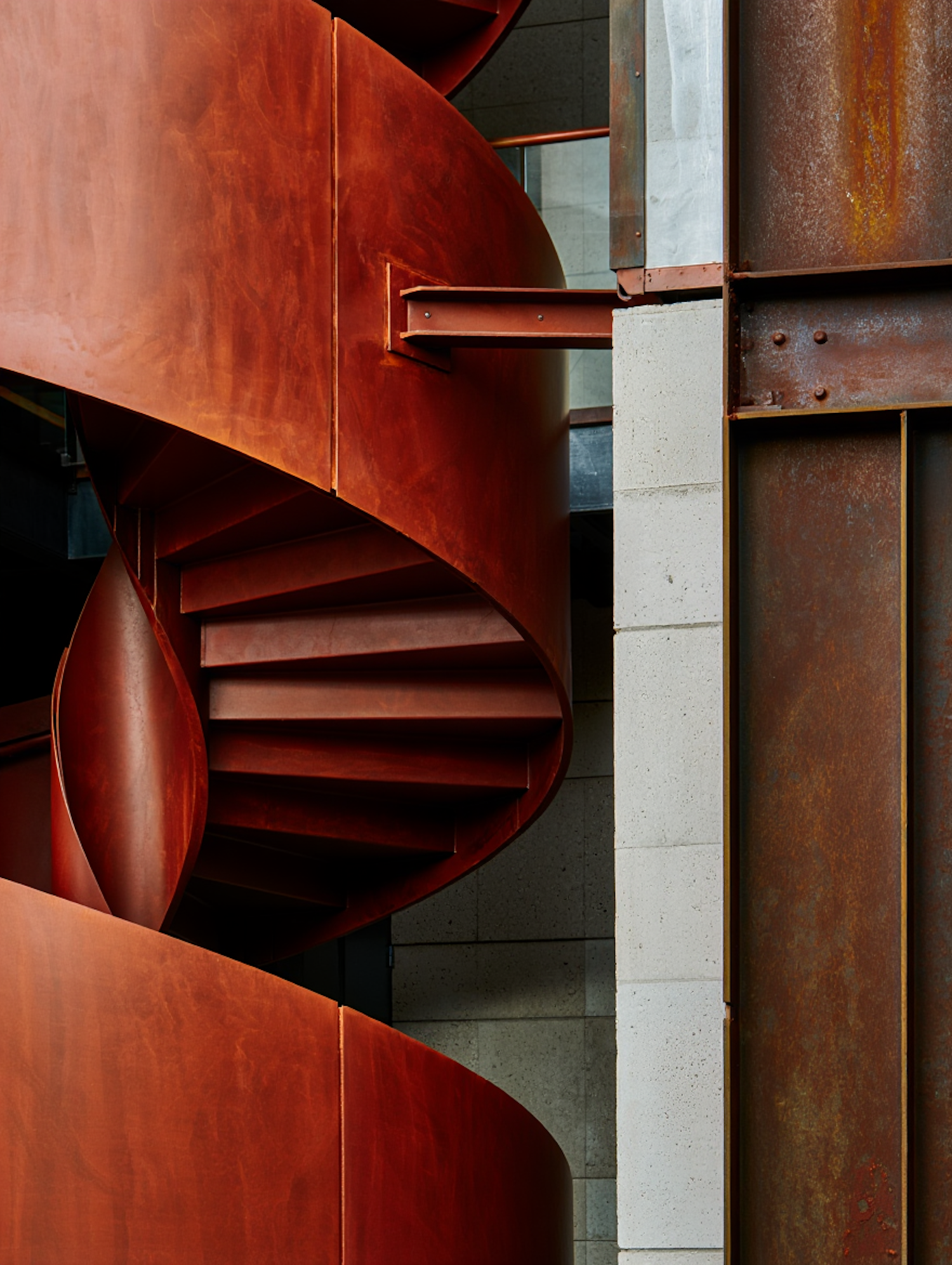 Rustic spiral staircase with bold curves against a concrete and steel backdrop, showcasing industrial design and raw material aesthetics.