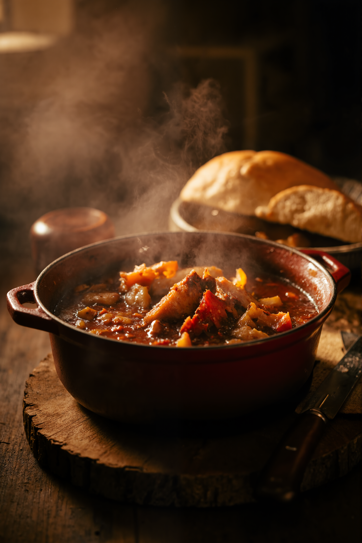 A steaming pot of hearty stew with meat and vegetables in a red pot, paired with crusty bread on a rustic wooden table.