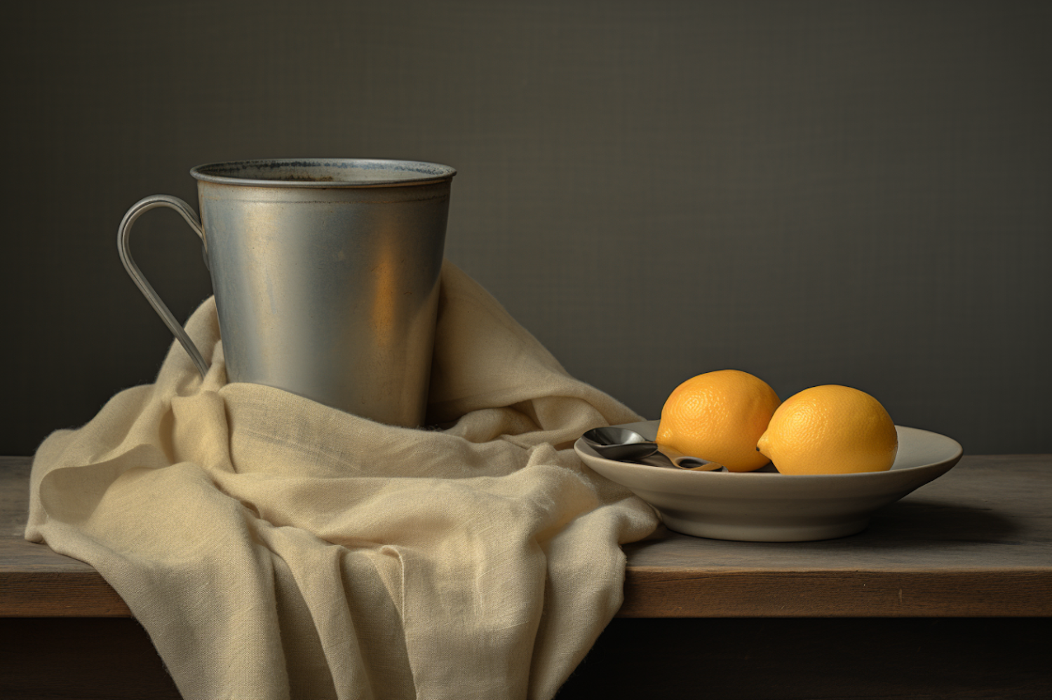 Rustic still life with a metallic mug, beige cloth, and lemons on a gray plate. Warm tones and serene composition.