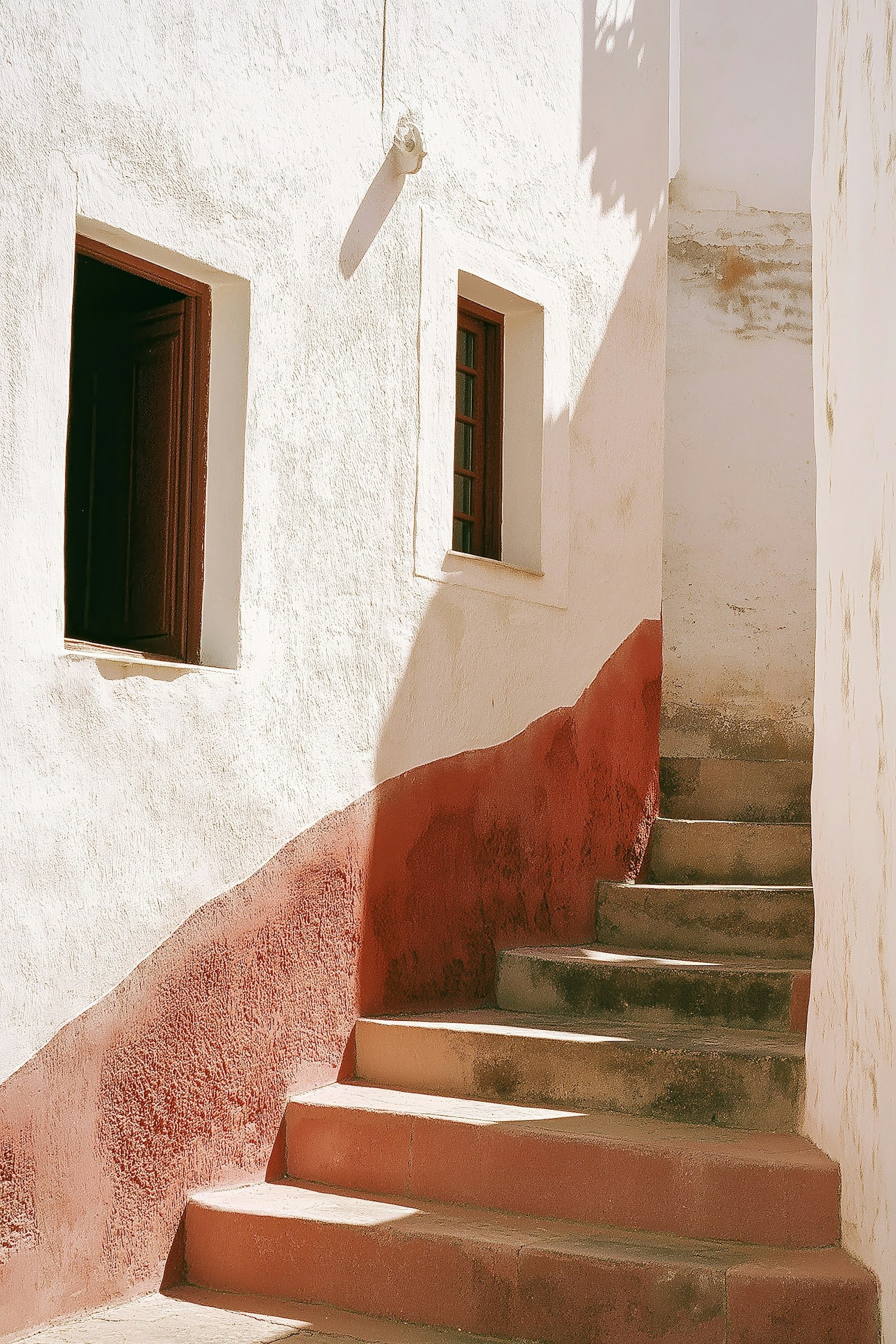 Sunlit stone stairs with red and white walls, rustic windows, and warm shadows, evoking a Mediterranean architectural charm.