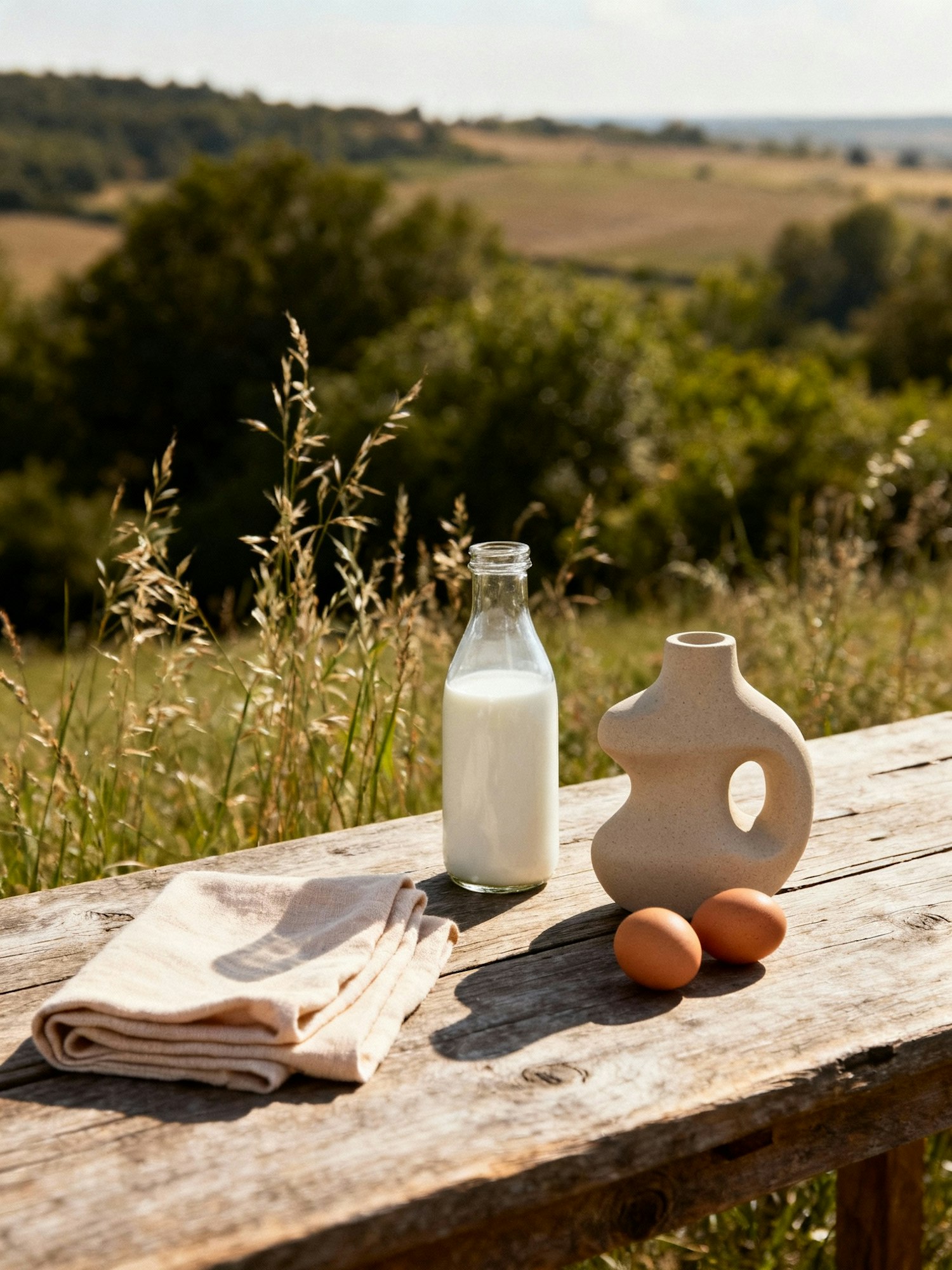 Rustic table with milk, eggs, and a ceramic vase in a serene countryside setting, surrounded by lush greenery and rolling hills.