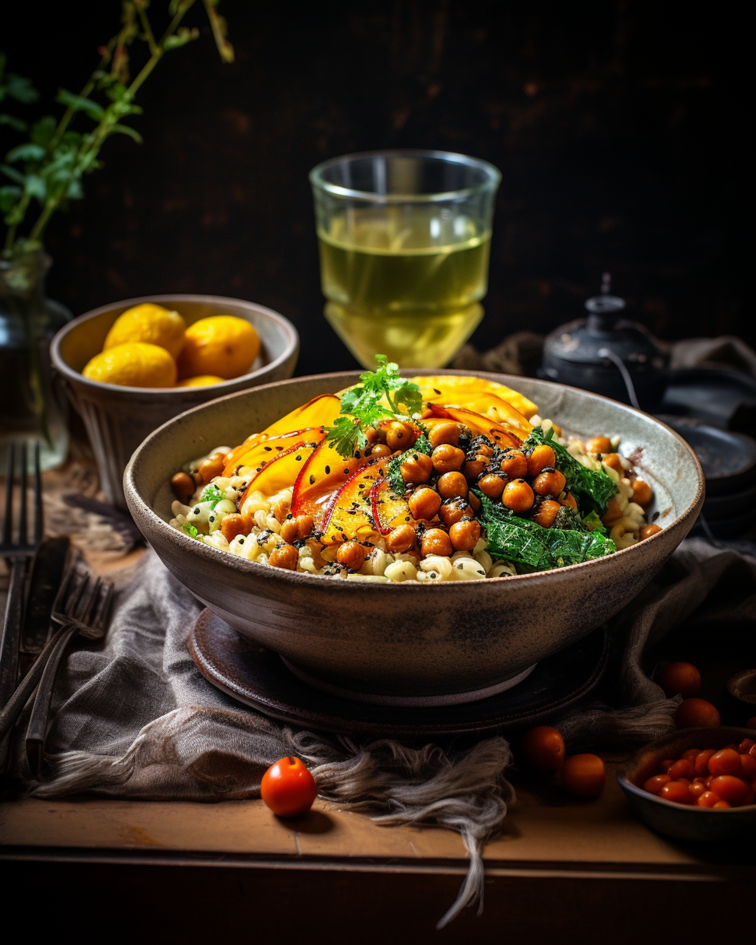 Rustic bowl with roasted chickpeas, mango slices, greens, and sesame seeds, paired with wine and lemons on a cozy wooden table.