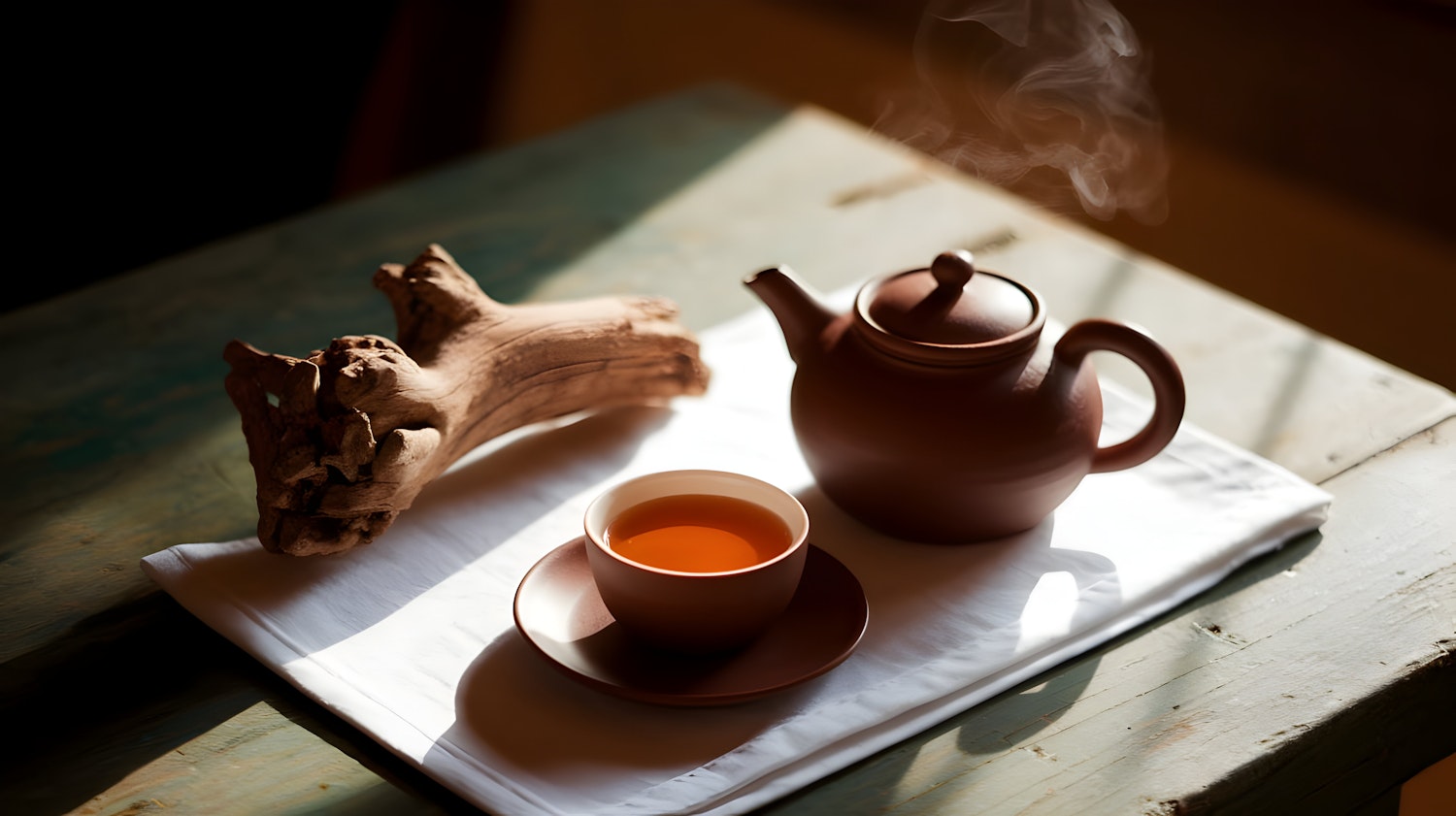 A rustic setup with a steaming clay teapot, teacup of amber tea, and driftwood on a sunlit wooden table. Perfect for tea lovers.