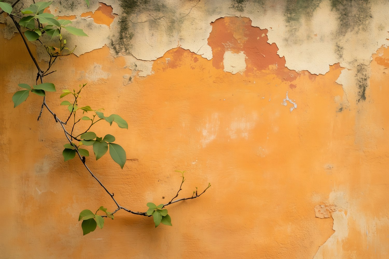 A rustic orange wall with peeling paint and a green vine climbing diagonally, creating a striking contrast of nature and texture.