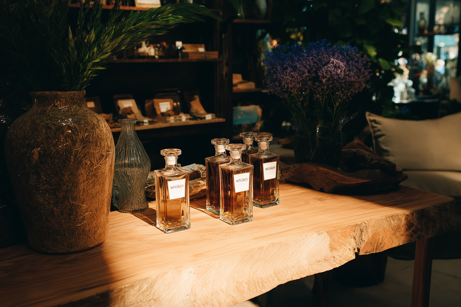 Rustic wooden table with whiskey bottles, green foliage, and purple flowers, set in a cozy, warmly lit environment.