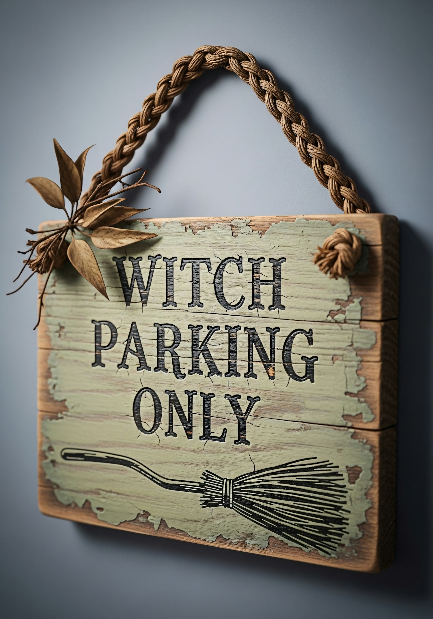 Rustic wooden sign with 'Witch Parking Only' text, distressed green paint, broomstick illustration, and braided rope hanger.