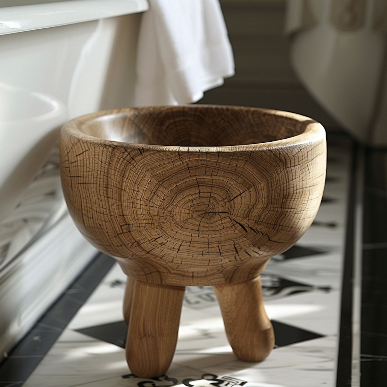 Rustic wooden bowl with cracked texture on three legs, set in a bathroom with geometric tiles and a white bathtub.