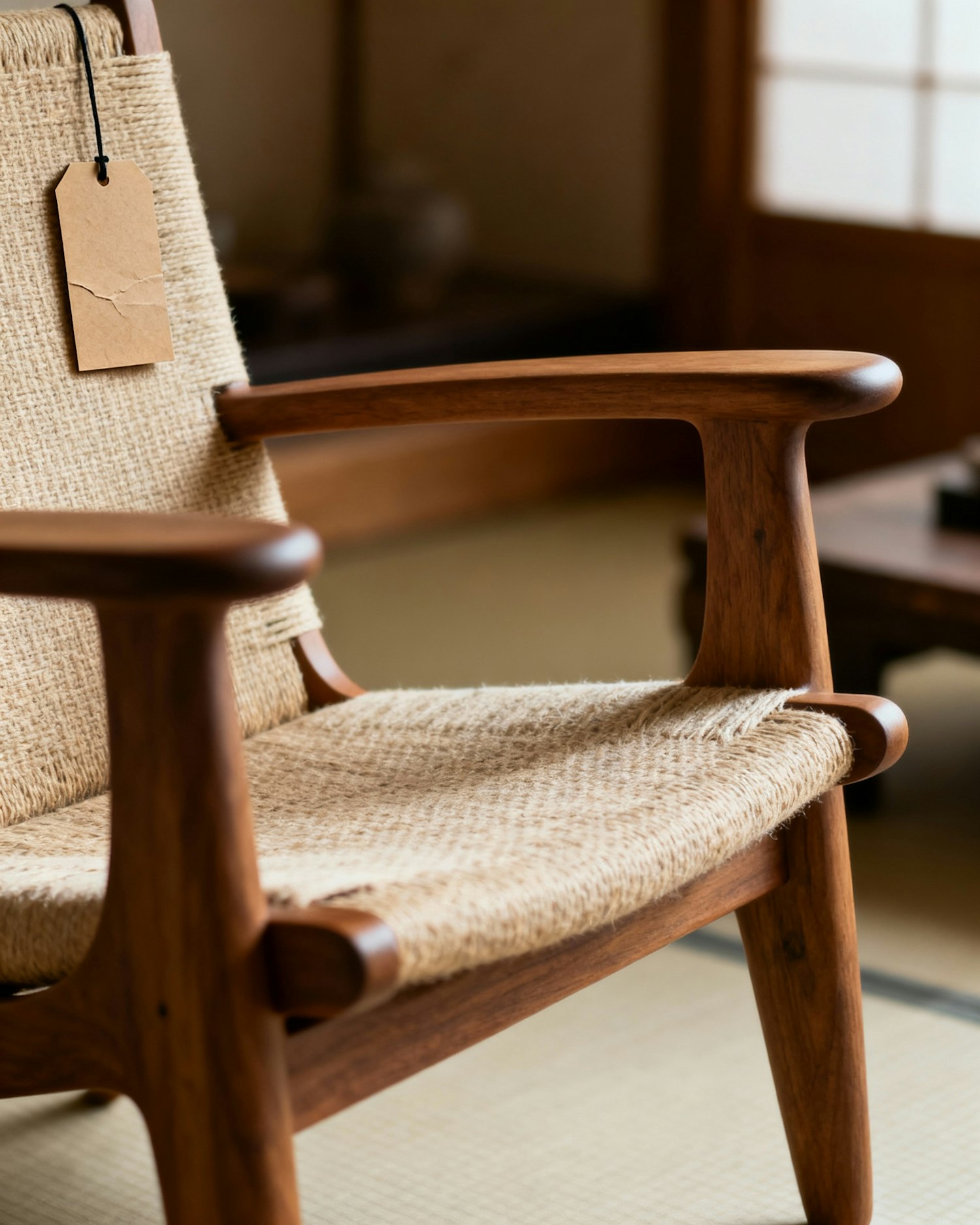 Minimal japanese interior design, wabi-sabi and japandi atmosphere, soft natural daylight, calm and quiet mood, realistic photography, subtle depth of field, balanced composition, minimal styling, handcrafted furniture, natural imperfections, organic forms, slow living aesthetic, no modern glossy look, no artificial lighting, editorial interior photography style Close-up detail of a sculptural japanese lounge chair with a solid wood frame and softly rounded armrest, upholstered seat in natural woven fabric, a small blank kraft paper tag hanging from the upper back with a thin black string, no text or branding on the tag, only blank paper texture. The background is softly blurred, hinting at a warm minimal interior space, daylight softly wrapping around the wood and fabric without strong contrast.