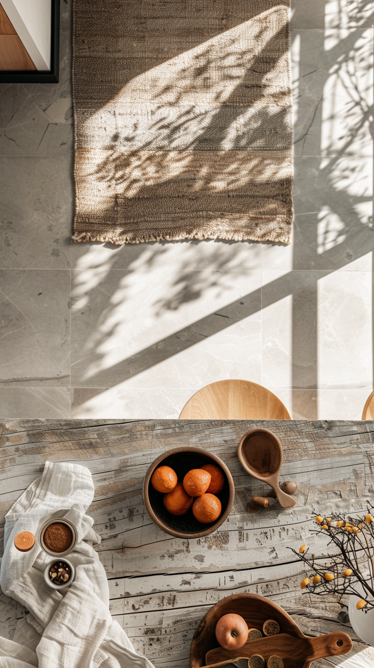 Sunlit rustic kitchen with tangerines, apple, and wooden decor on a textured table. Warm, earthy tones create a cozy atmosphere.