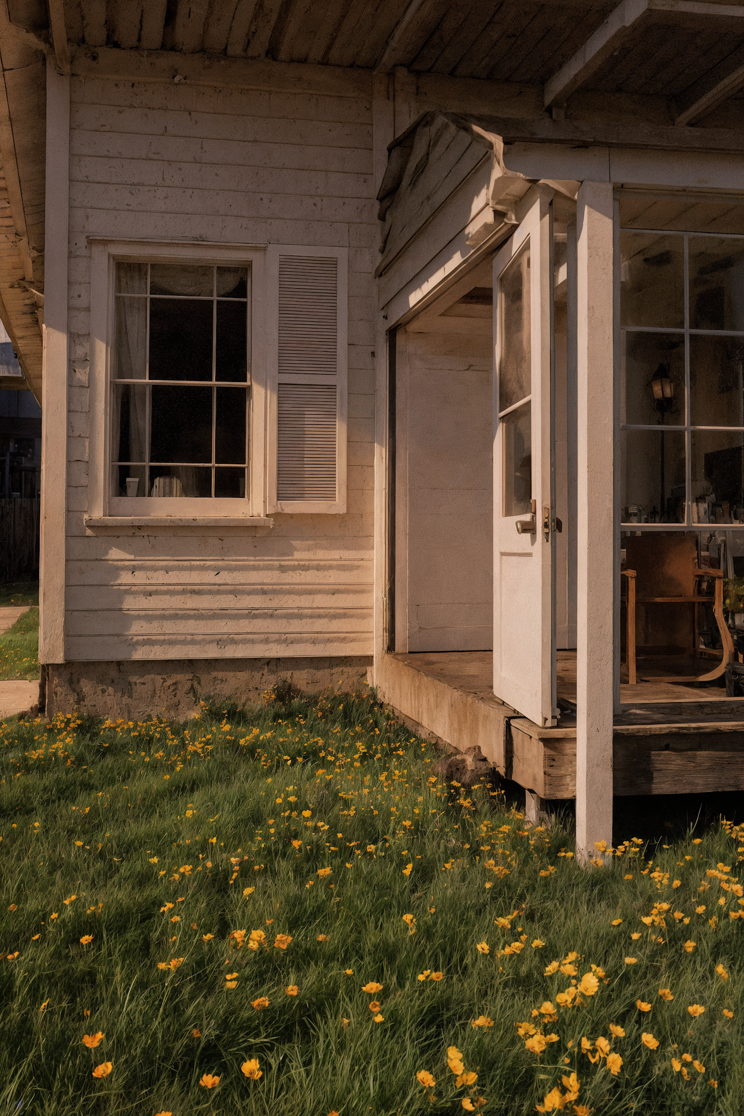 Charming rustic house with a weathered porch, open door, and a yard filled with vibrant yellow flowers under warm evening light.