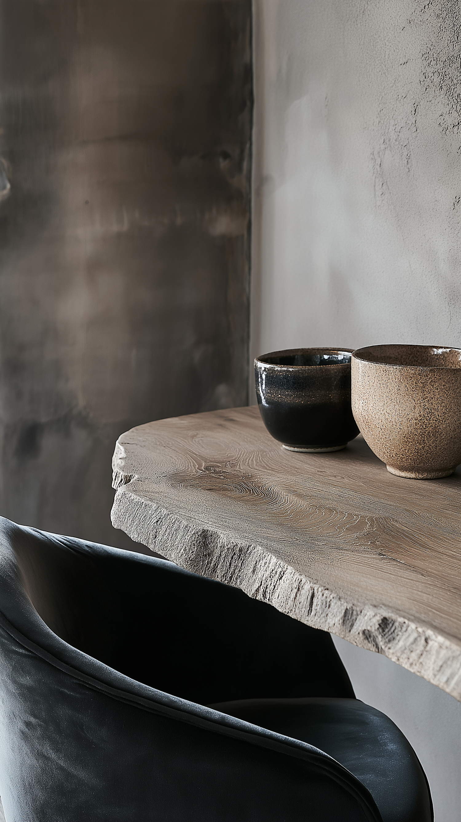 Rustic wooden table with ceramic bowls and a leather chair in a minimalist setting, highlighting natural textures and earthy tones.