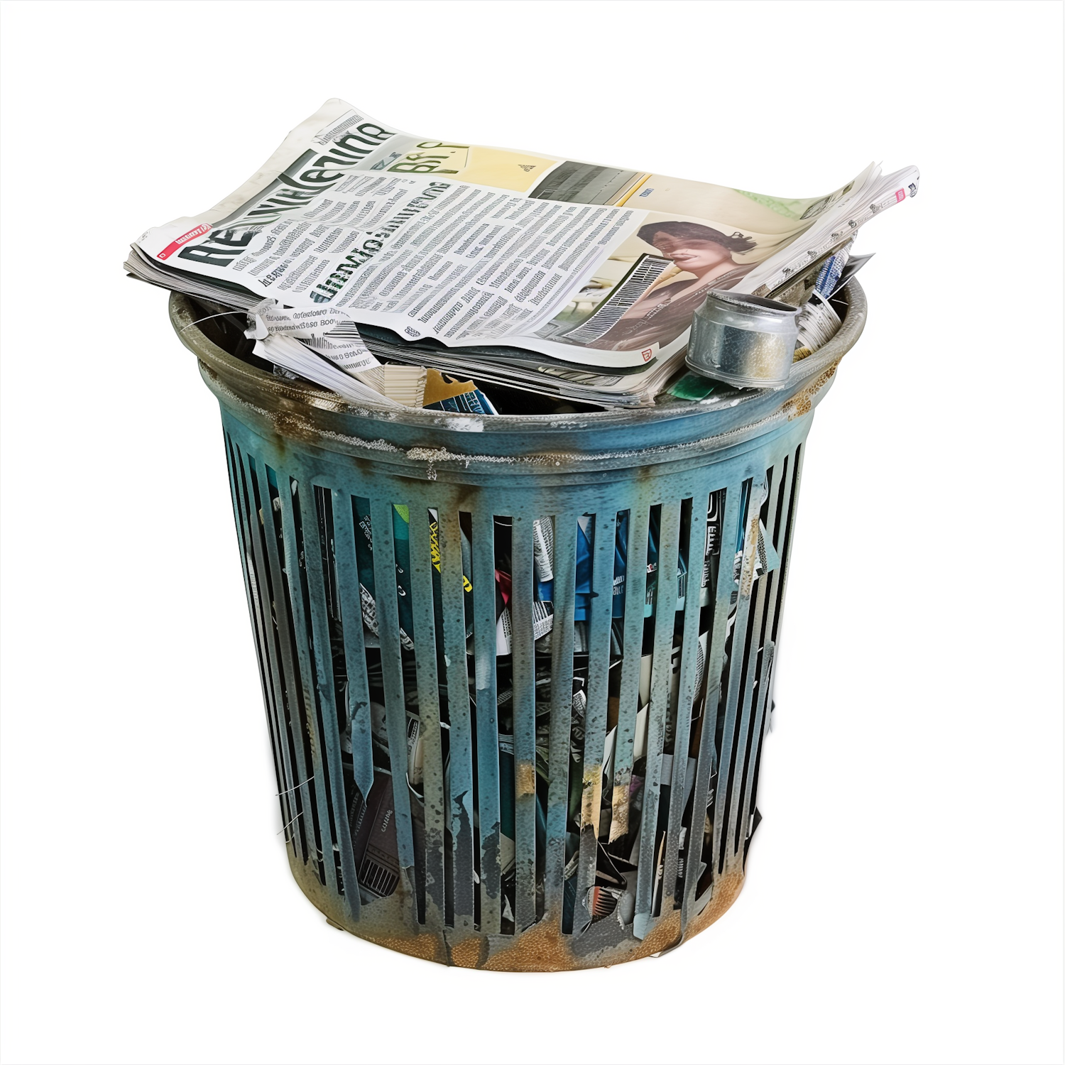 A rusty metal trash can overflowing with newspapers, cans, and paper waste against a plain white background.