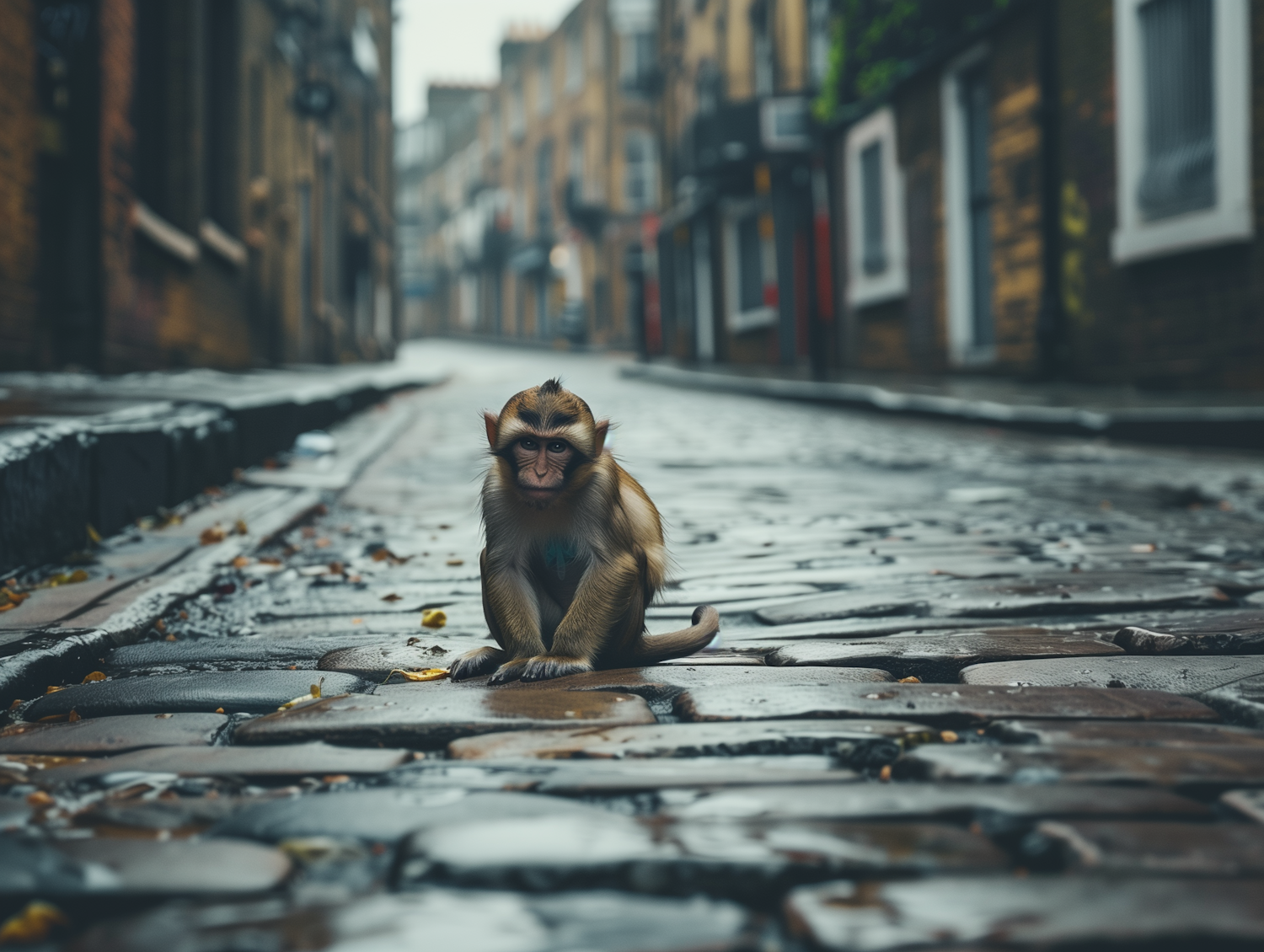 A curious monkey sits on a wet cobblestone street surrounded by old brick buildings on an overcast day.