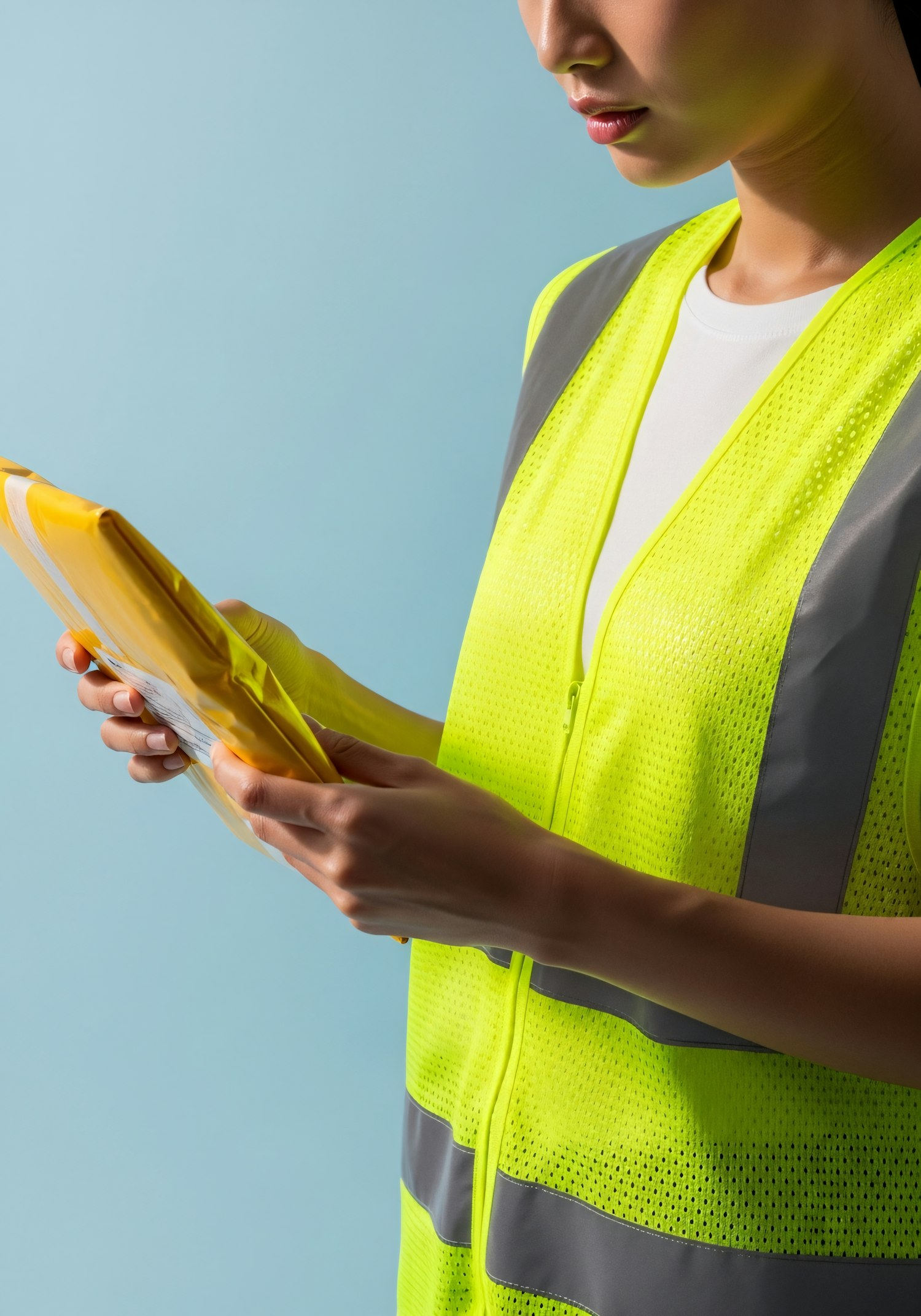 A person in a yellow safety vest holds a yellow package against a light blue background, emphasizing safety and professionalism.