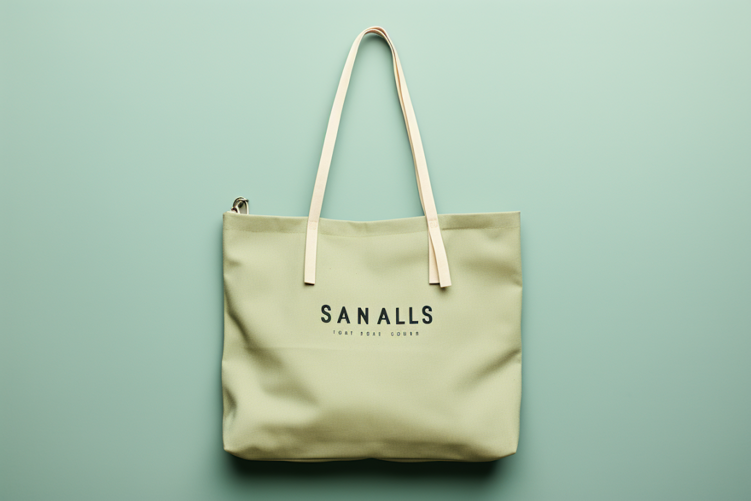 Elegant olive green tote bag with beige handles and 'SANALLS' branding on a soft green background.