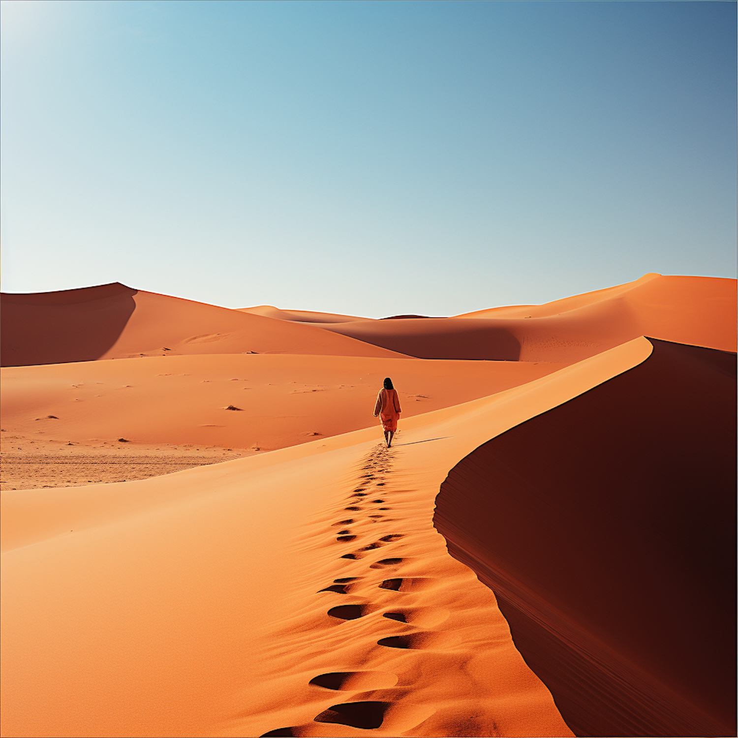 A lone figure walks across vast orange sand dunes under a clear blue sky, leaving footprints behind. A serene desert landscape.