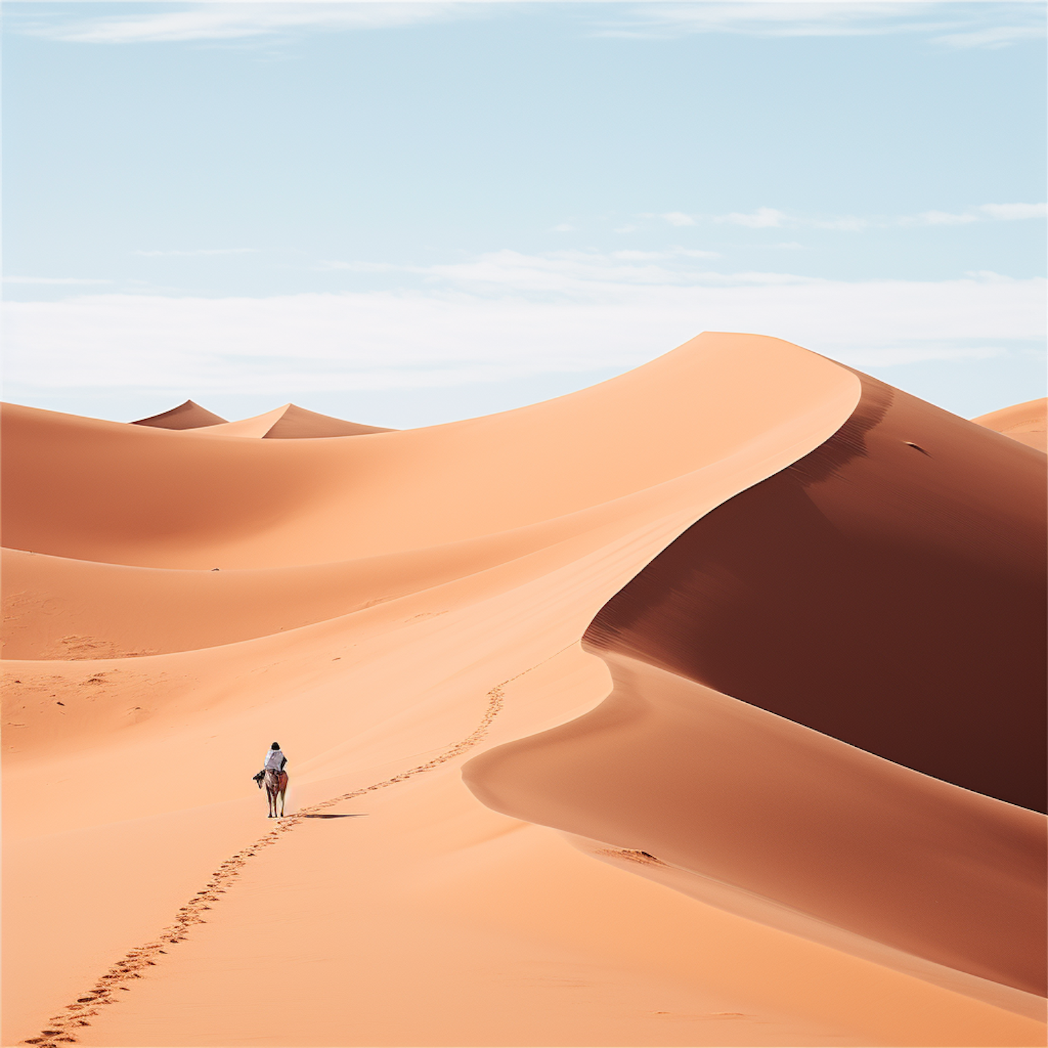 A lone traveler walks across vast orange sand dunes under a clear blue sky, leaving footprints in the desert landscape.