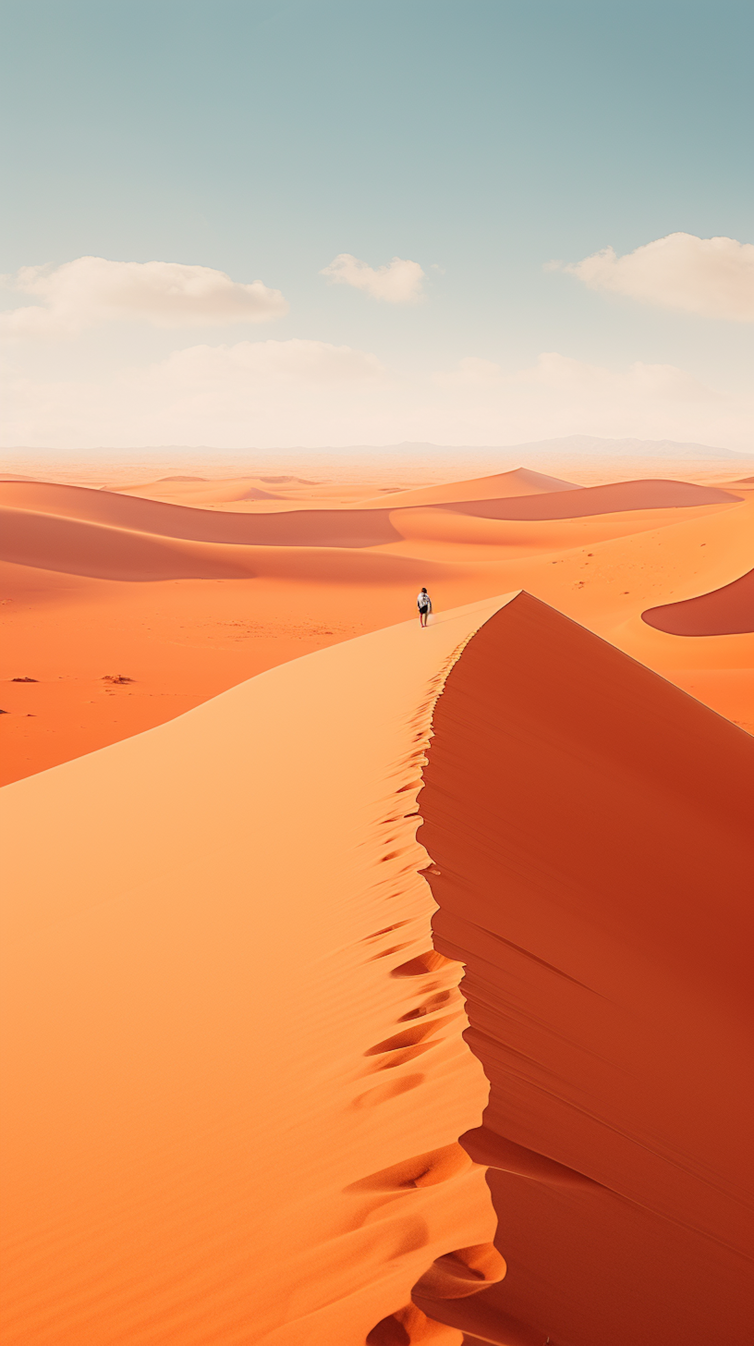 A lone traveler walks along a vast orange sand dune under a clear blue sky, capturing the essence of solitude and adventure.