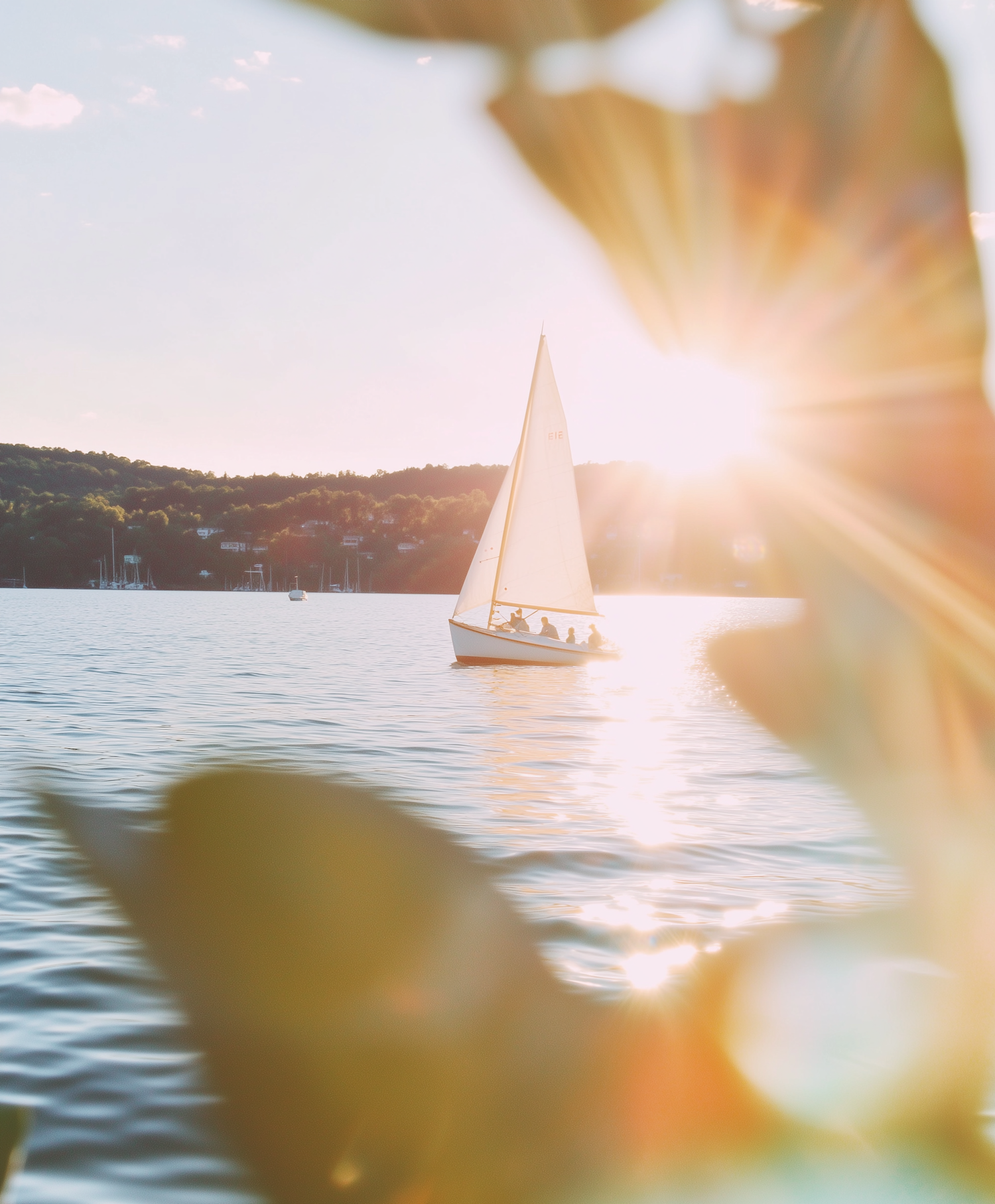 A sailboat on a calm lake at sunset, framed by blurred leaves and golden sunlight, creating a serene and dreamy atmosphere.