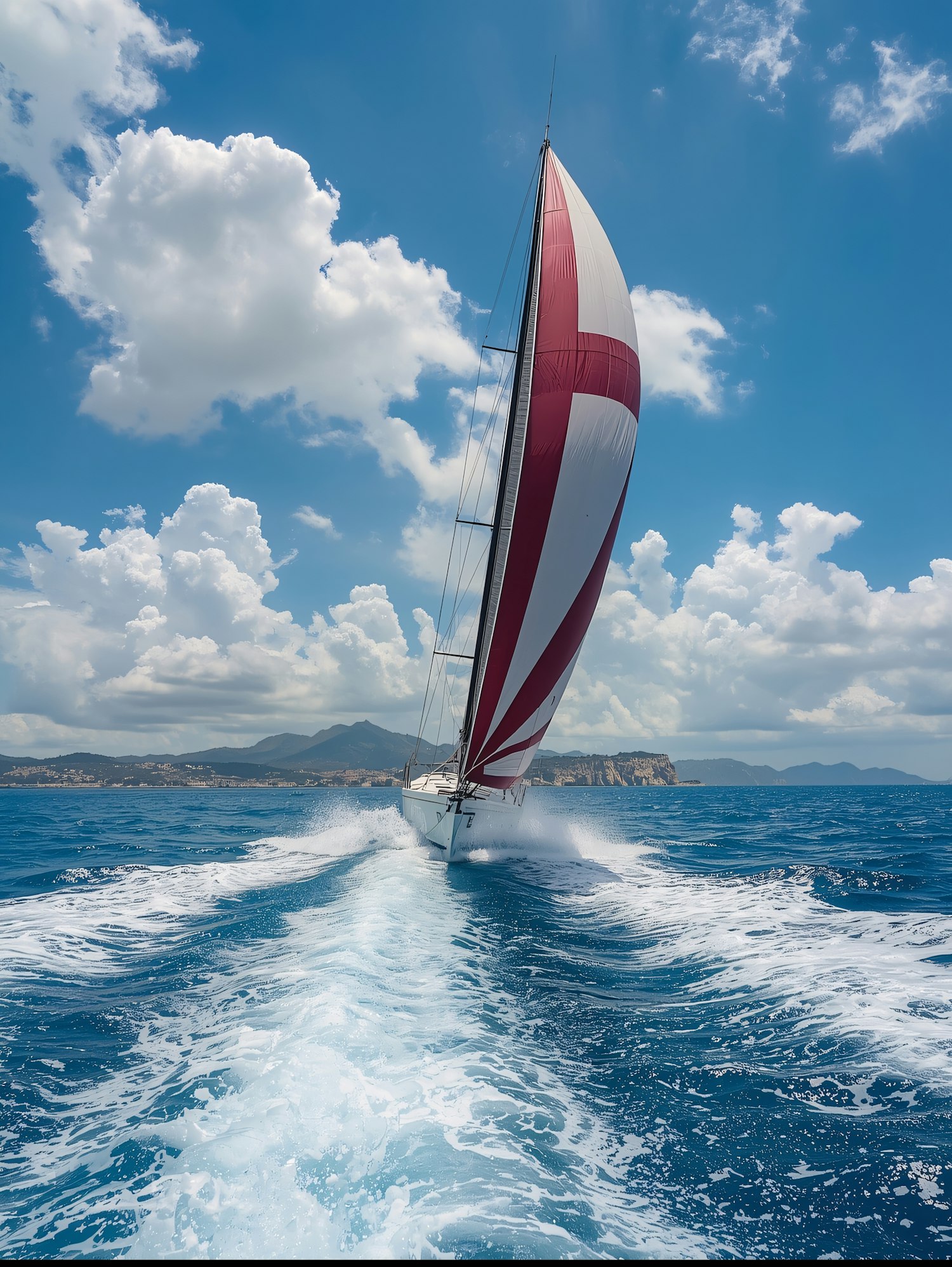 A sailboat with a red and white spinnaker sails through blue waters under a bright sky, leaving a foamy wake behind. Coastal cliffs in the distance.
