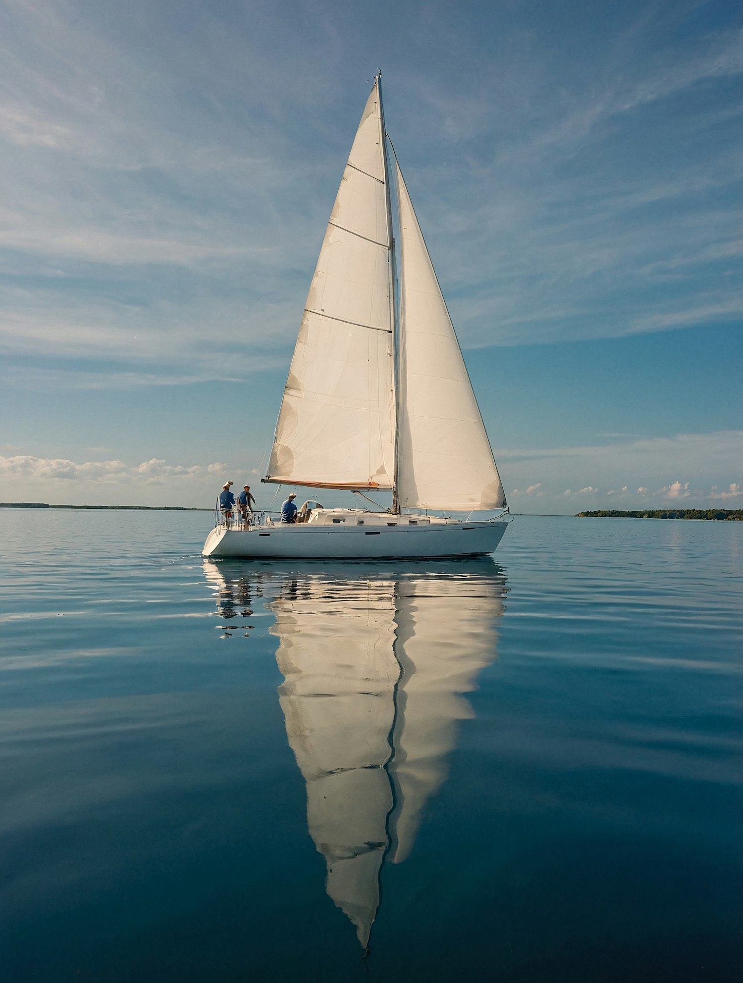 A white sailboat with full sails reflects on calm water under a clear blue sky, creating a peaceful and picturesque scene.