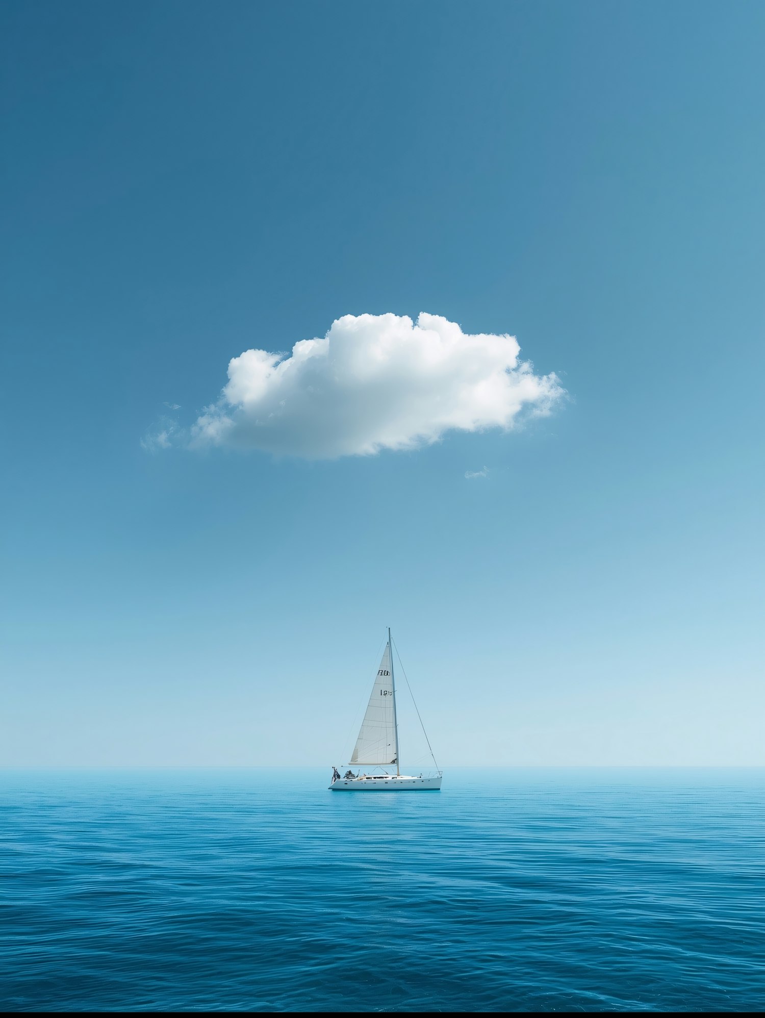 A sailboat on calm blue waters under a clear sky with a single fluffy cloud, creating a serene and minimalist seascape.