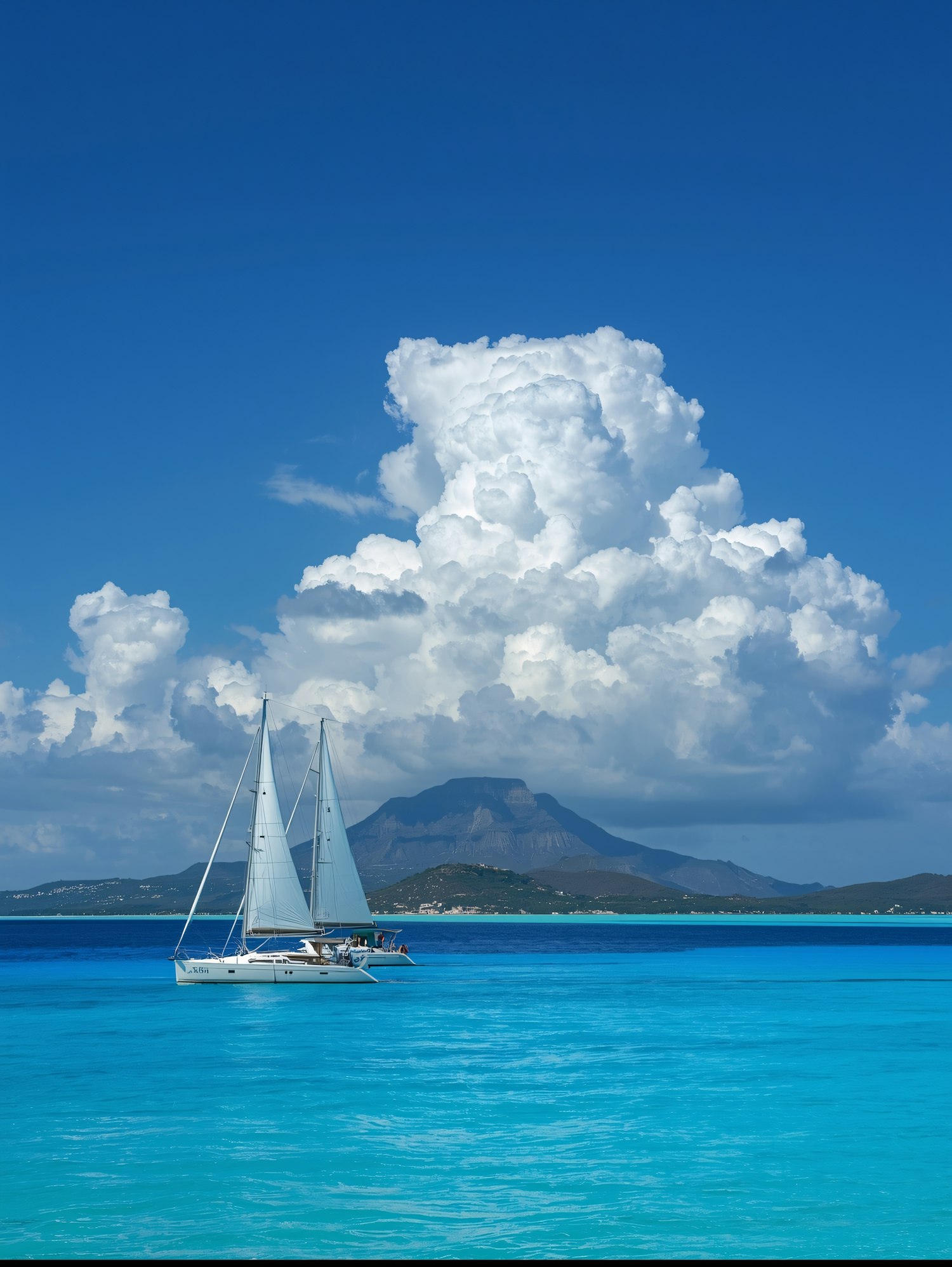 A sailboat glides on turquoise waters under a blue sky with dramatic clouds and a distant mountain, creating a serene tropical scene.