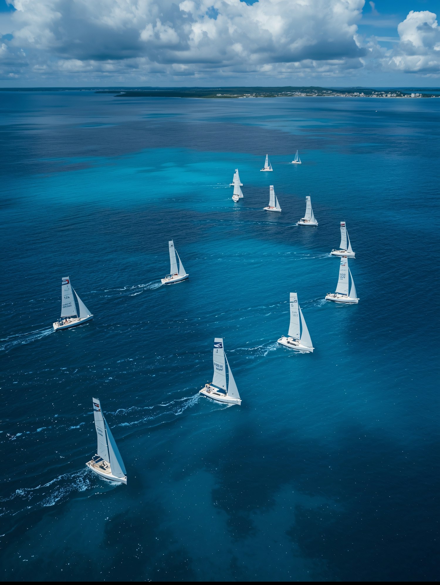 Aerial view of a fleet of sailboats navigating a vibrant blue ocean under a partly cloudy sky, with a distant coastline in view.