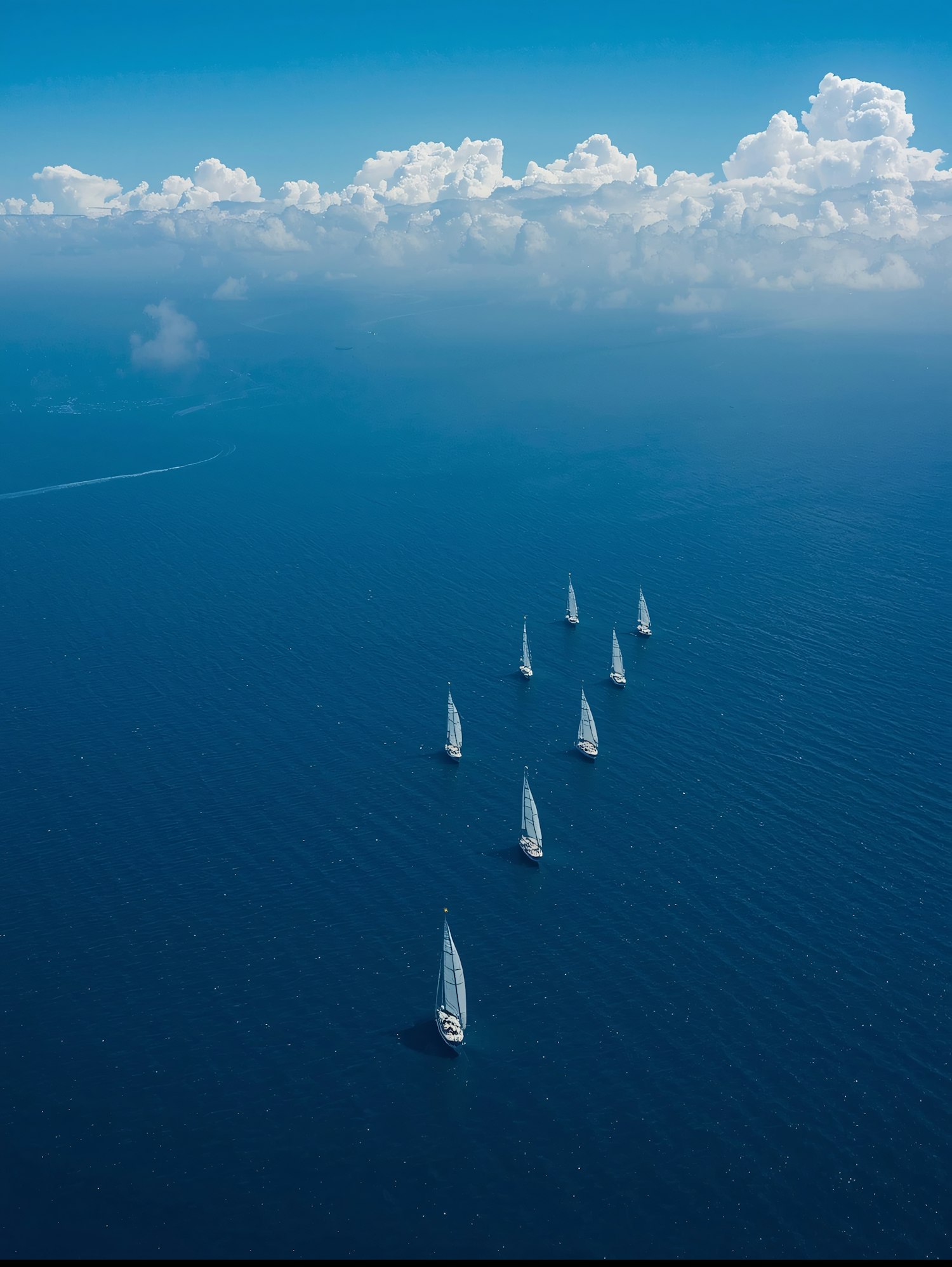 Aerial view of sailboats in formation on a calm blue ocean under a bright sky with fluffy clouds, creating a serene maritime scene.