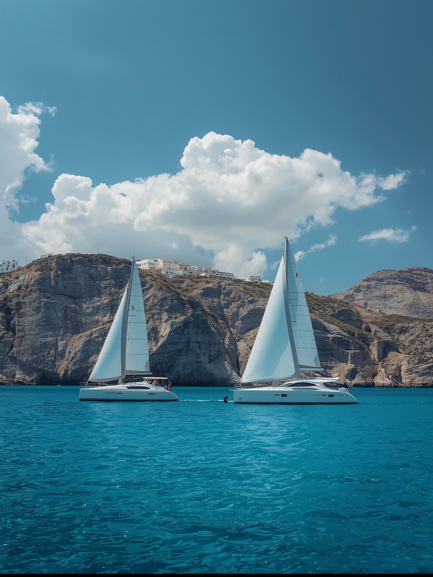 Two elegant sailboats on a clear blue sea with stunning cliffs and a bright sky in the background, perfect for a serene coastal escape.