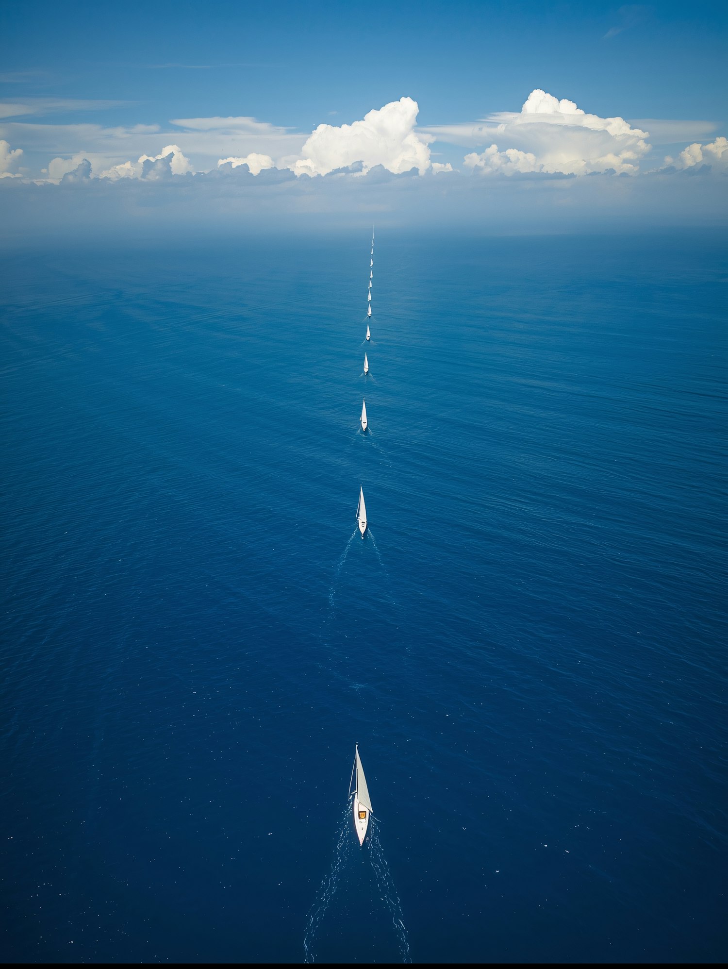 A stunning aerial view of sailboats in a perfect line on a calm blue ocean under a clear sky with fluffy clouds.