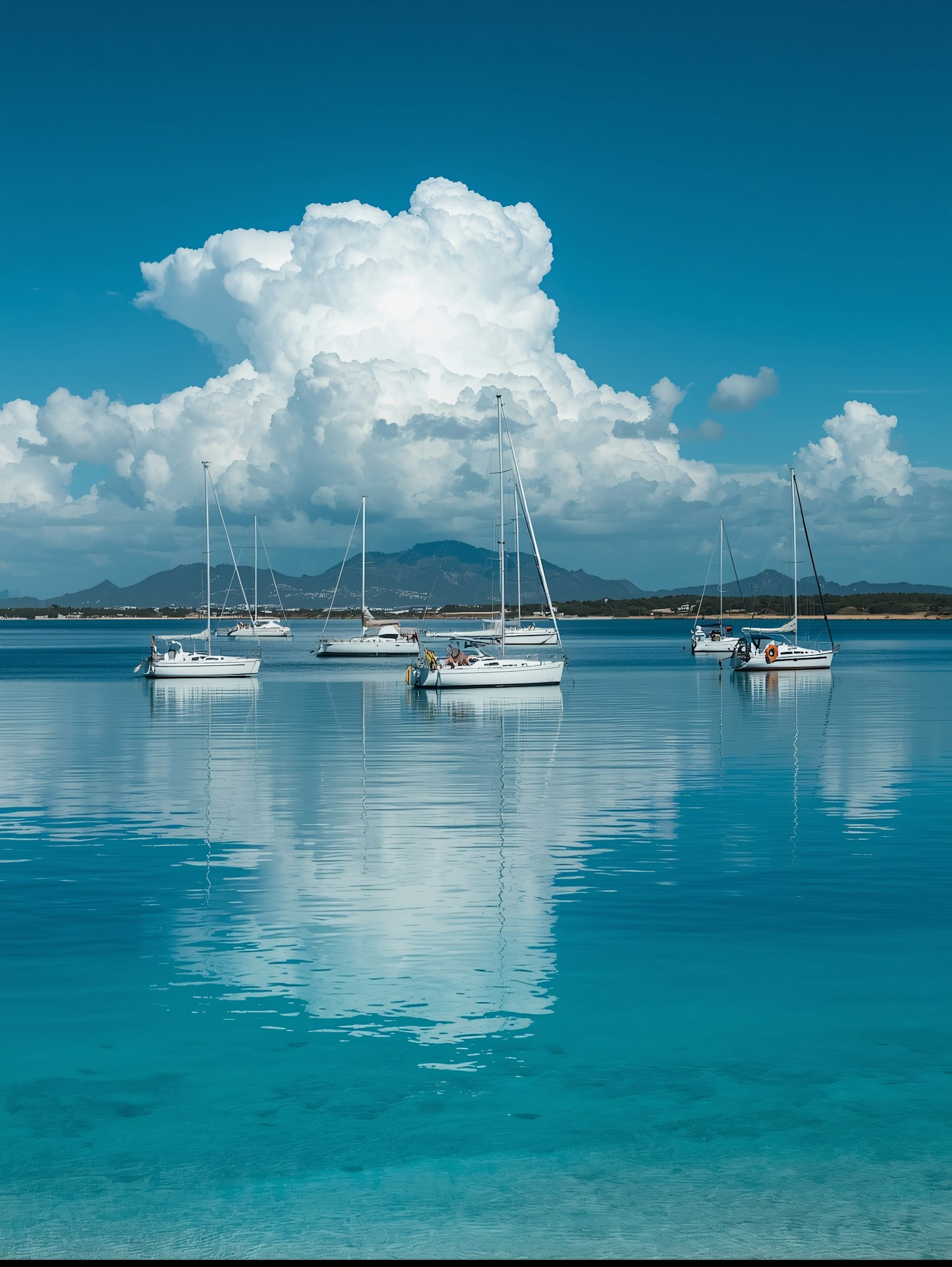 Serene scene of sailboats anchored on a calm, clear blue sea with a backdrop of mountains and fluffy white clouds under a bright blue sky.