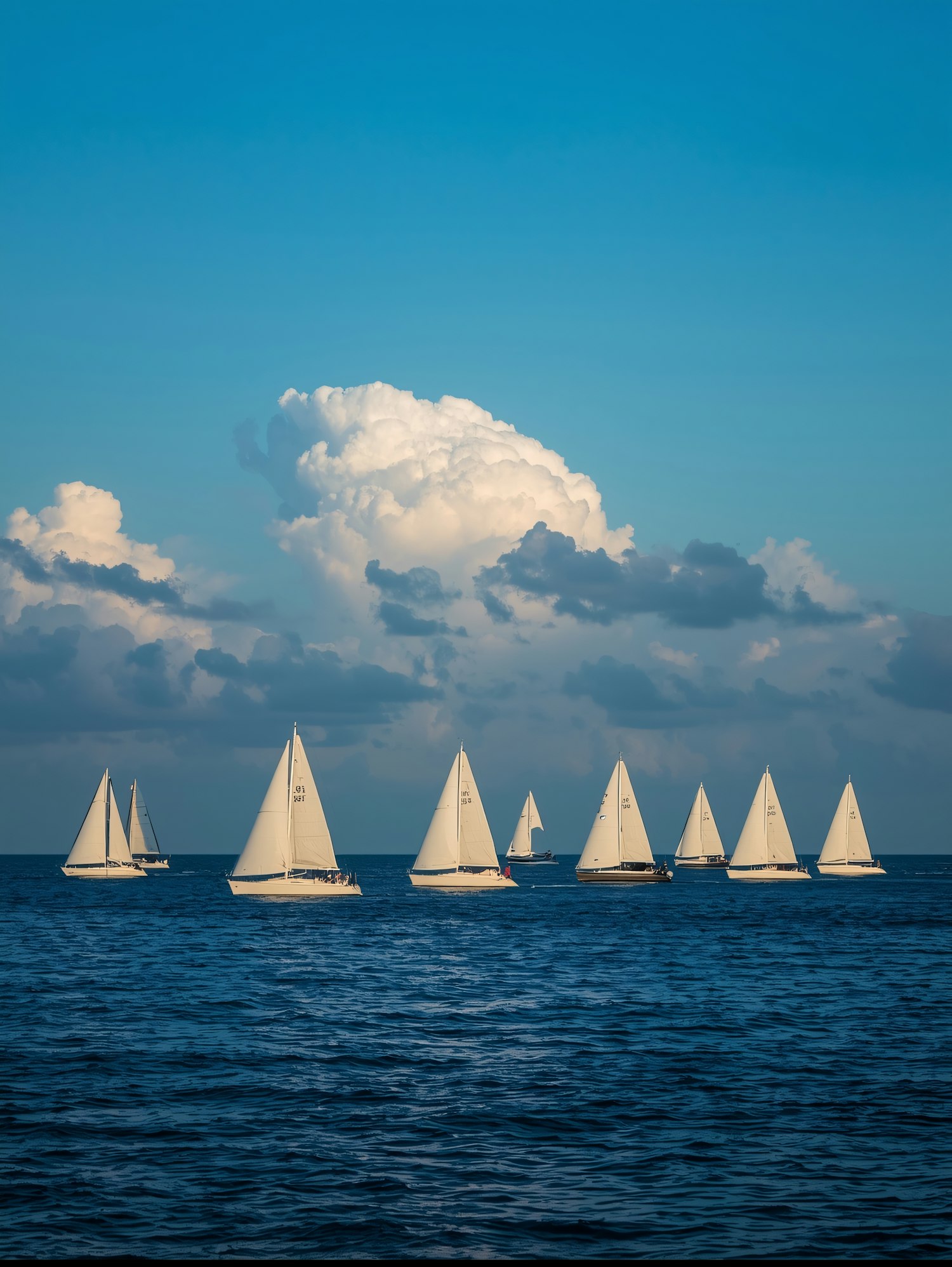 A group of white sailboats sailing on a calm blue sea under a clear sky with fluffy clouds, creating a peaceful maritime scene.