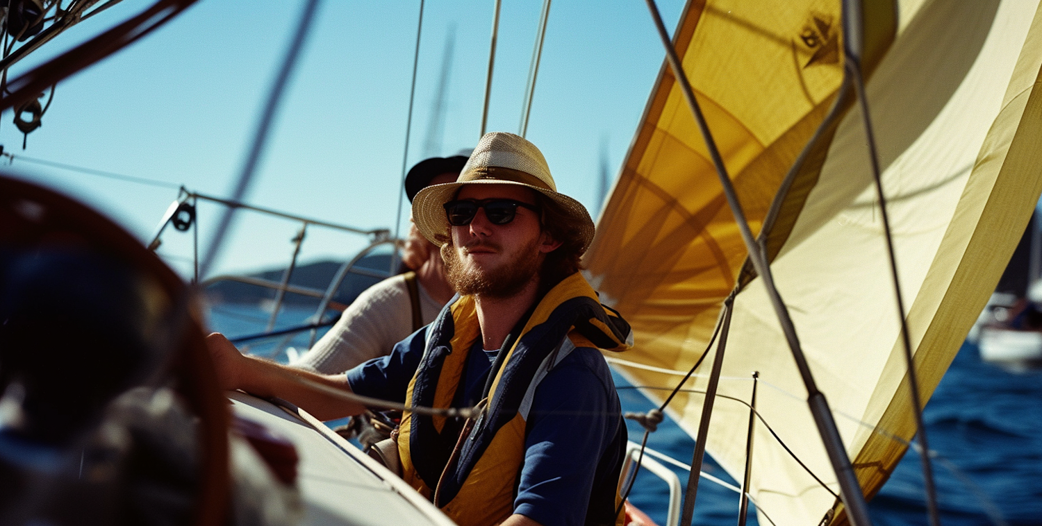 Young man in straw hat and sunglasses sailing on a sunny day, with a vibrant yellow sail and blue sky in the background.