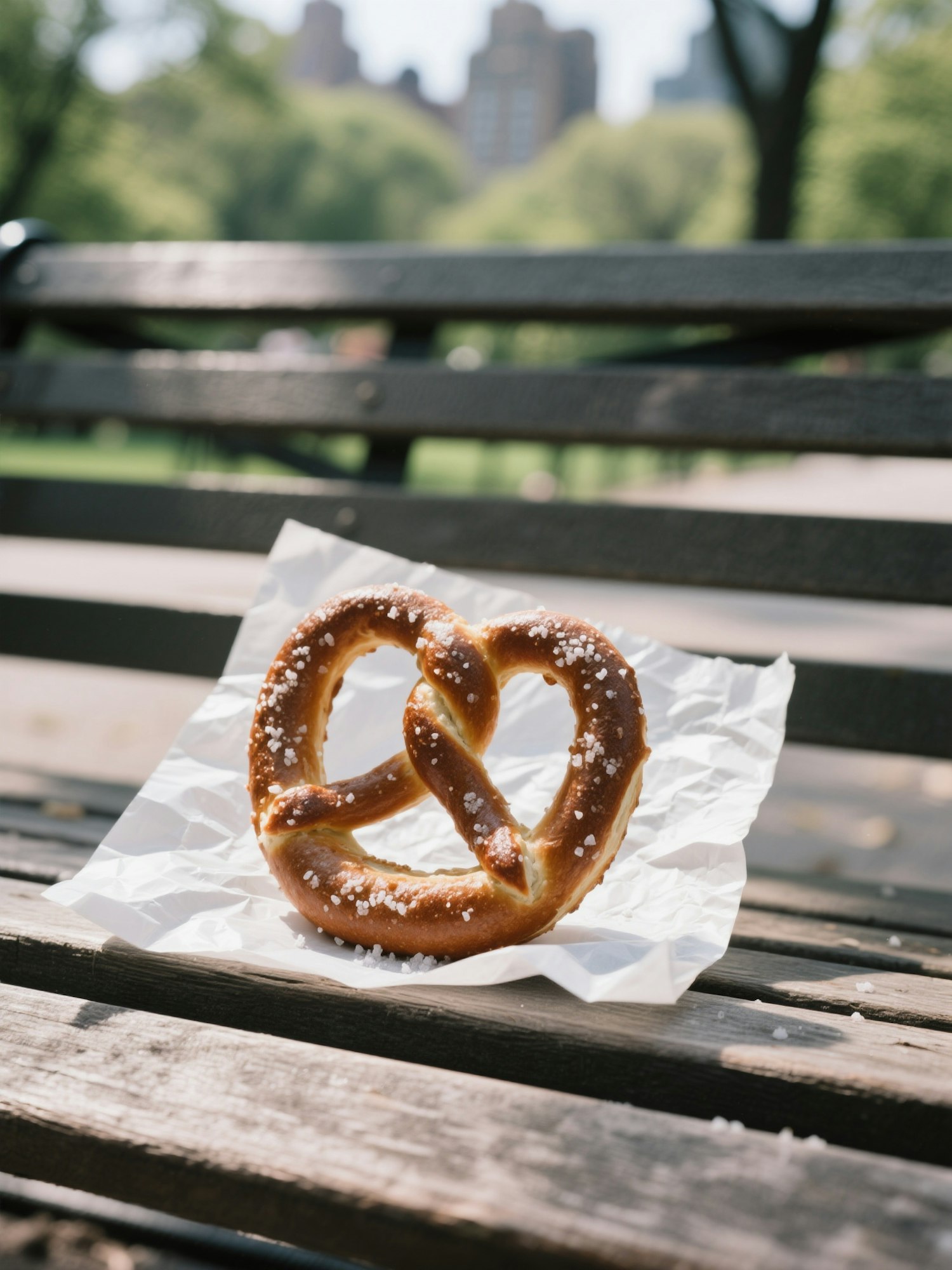 Golden brown salted pretzel on a park bench, surrounded by a sunny park with trees and distant buildings in the background.