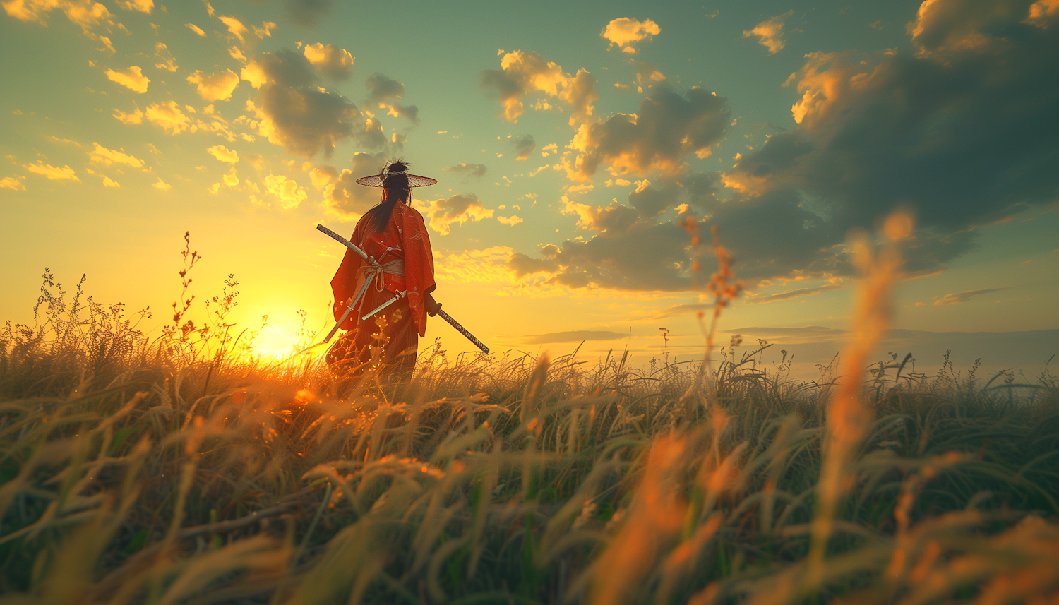 A lone figure in a red kimono with a katana stands in a golden field at sunset, evoking serenity and cinematic beauty.