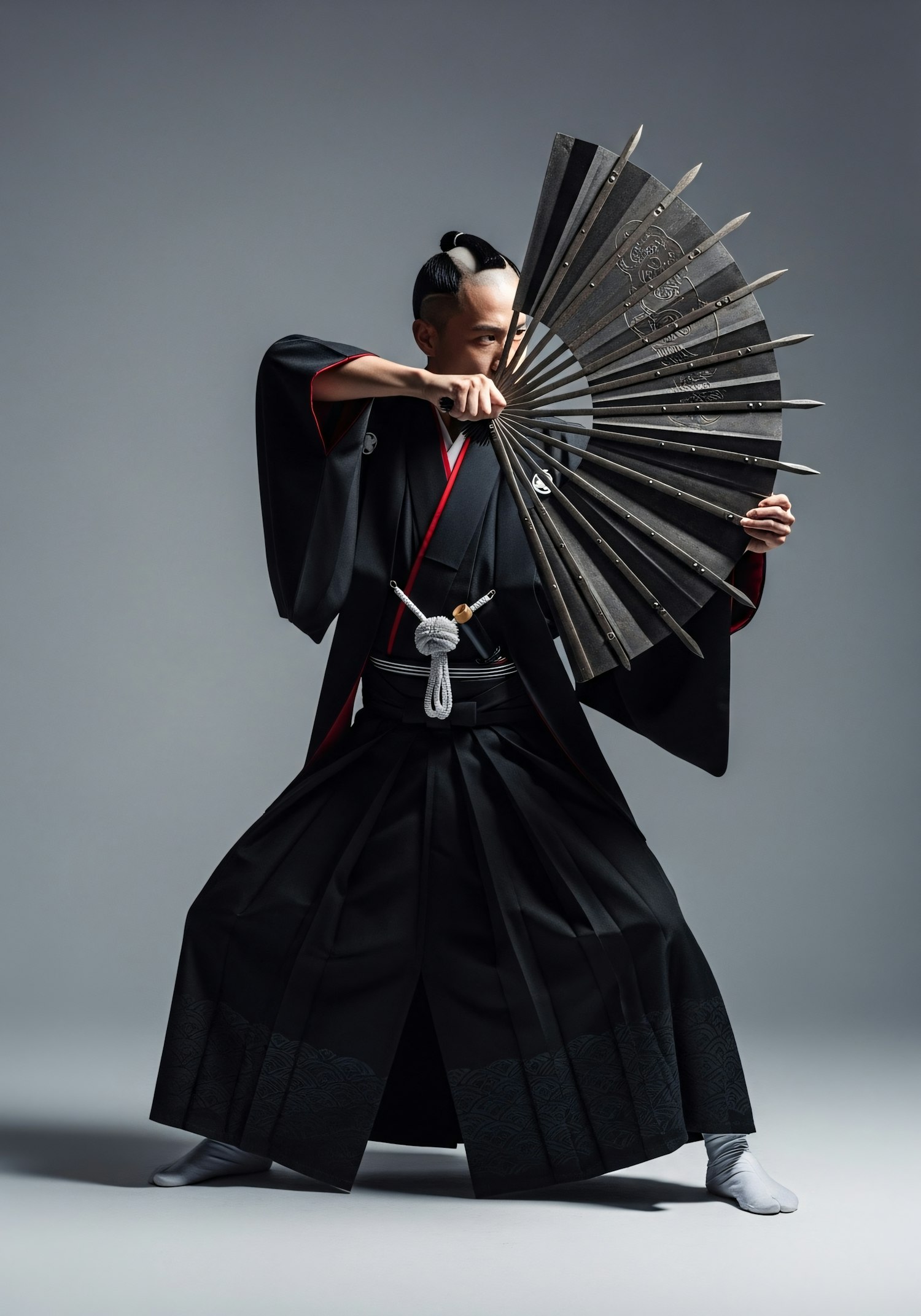 A person in traditional Japanese attire poses dynamically with a large, ornate fan resembling a weapon, set against a neutral background.