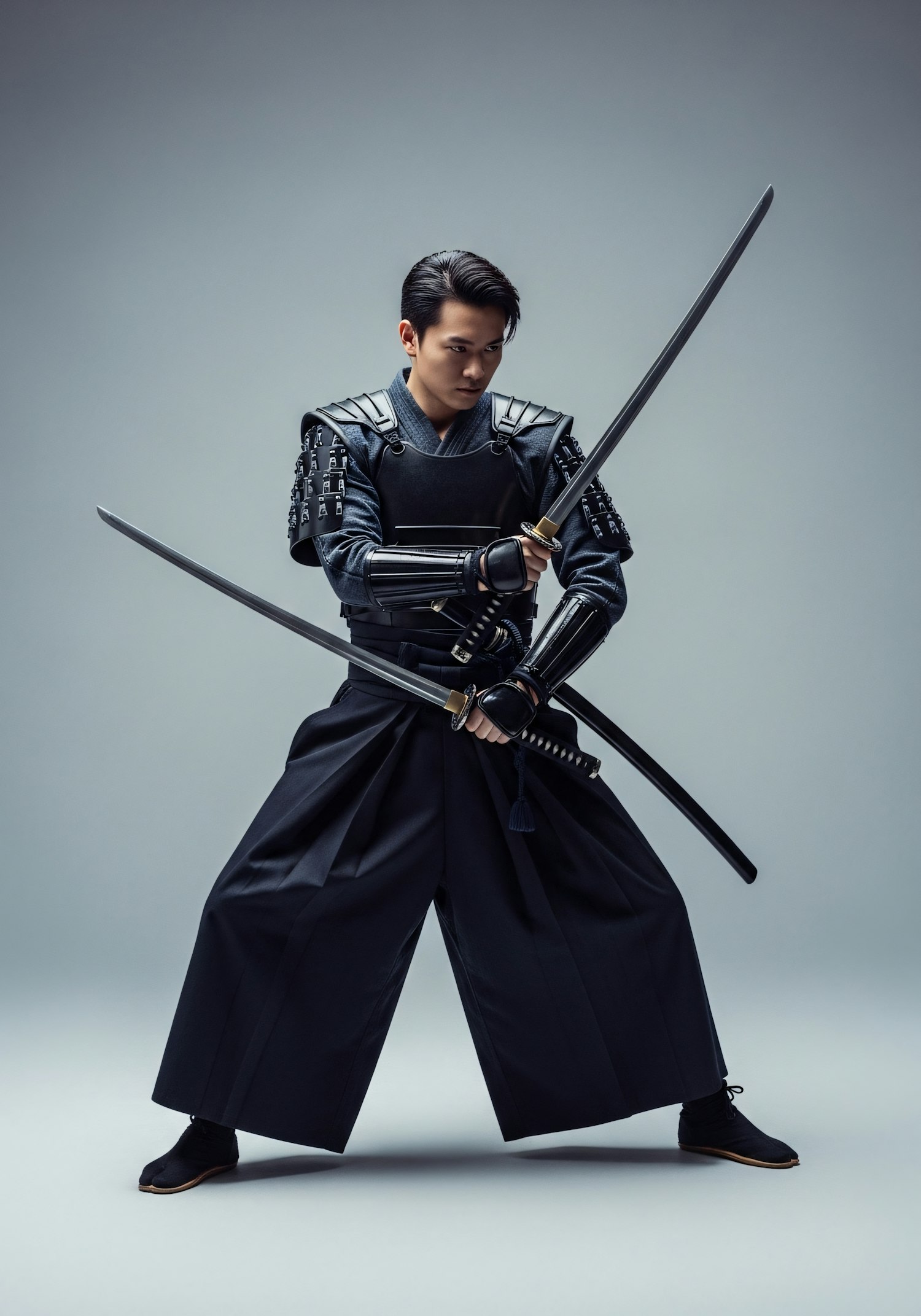 A person in traditional samurai armor poses with two katana swords, showcasing a dynamic and intense stance against a neutral background.