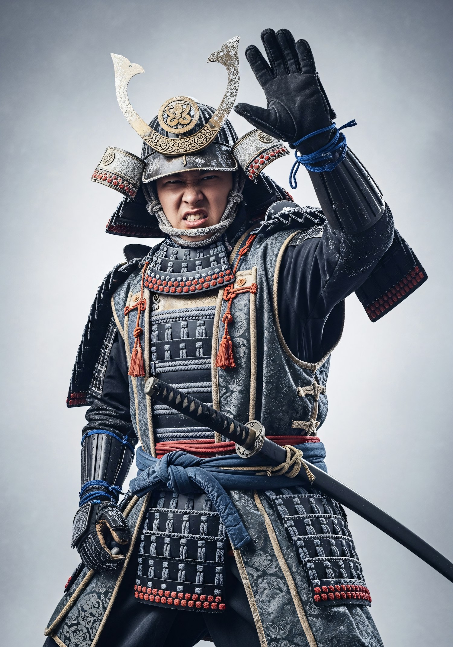 A person in traditional samurai armor with a raised hand and intense expression, showcasing intricate details and a katana at their side.
