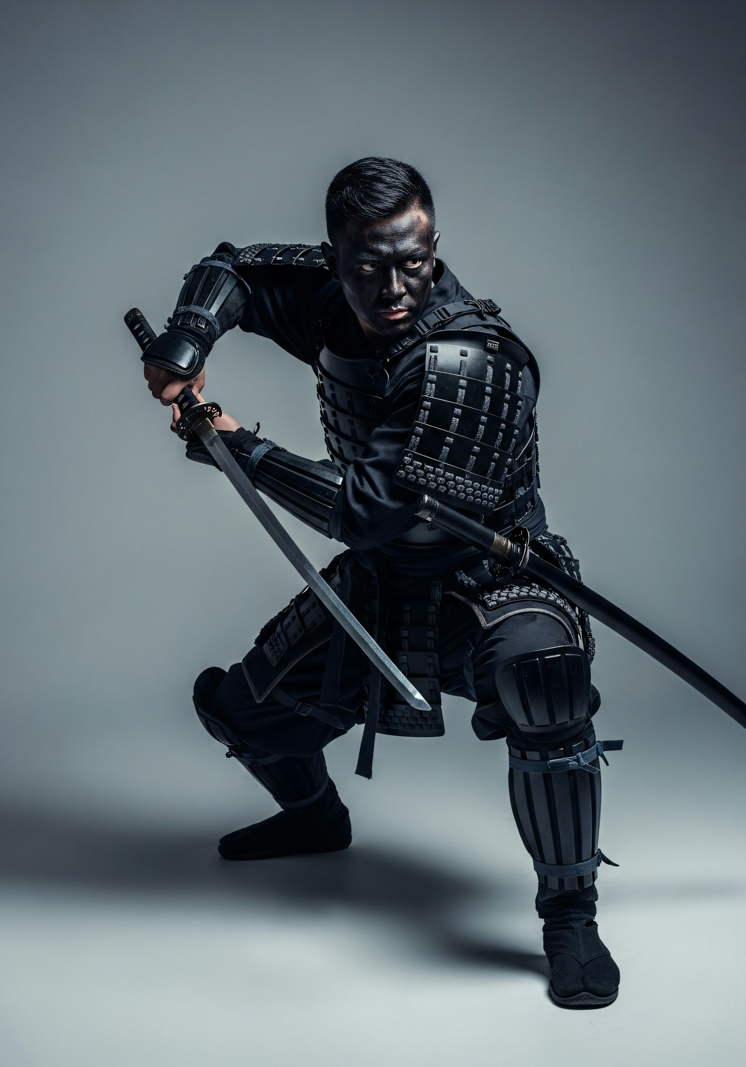 A person in traditional samurai armor poses dynamically with a katana, showcasing intricate details and a dramatic stance.