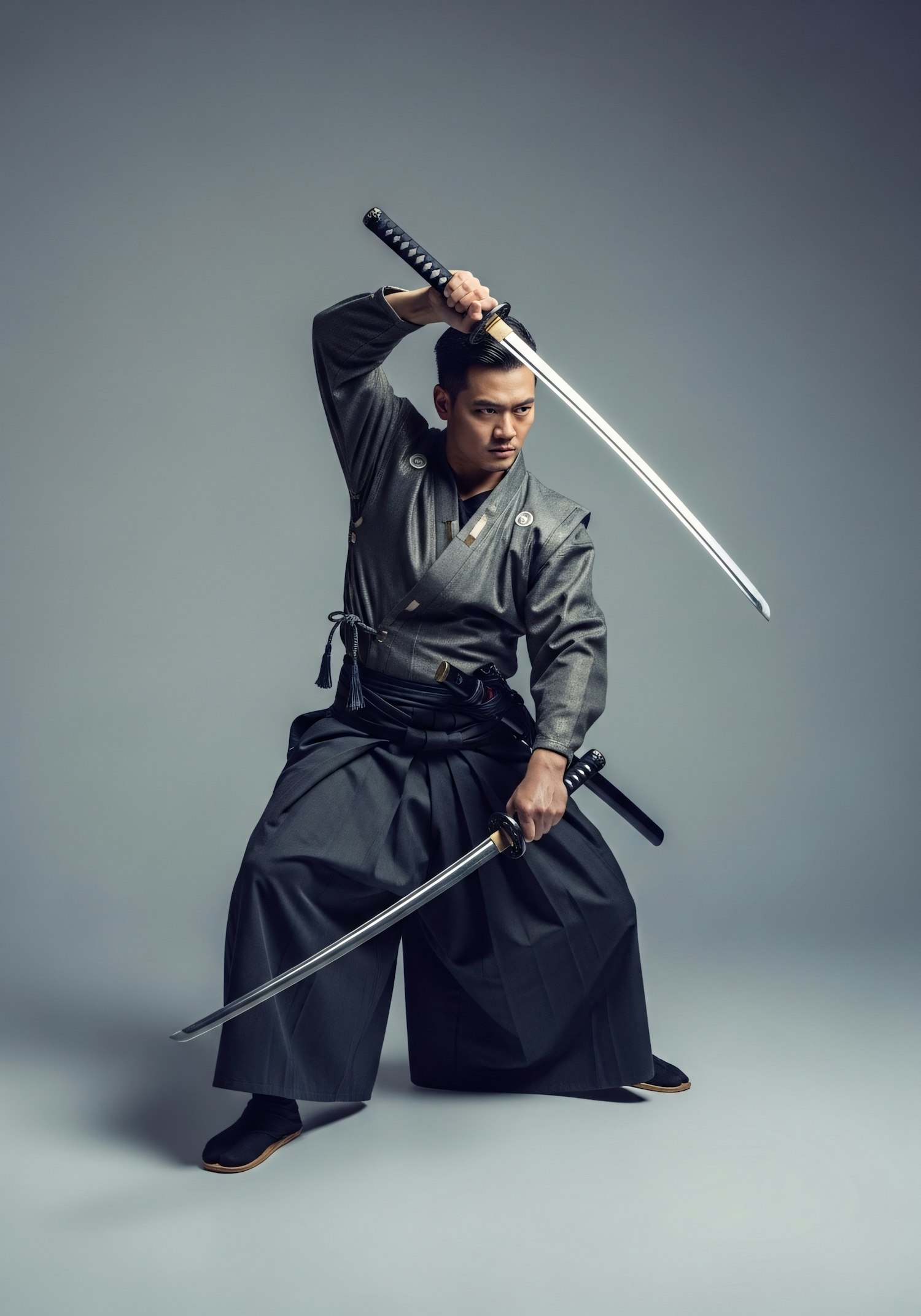 A samurai in traditional attire poses dynamically with two katana swords, showcasing skill and focus against a neutral gray background.