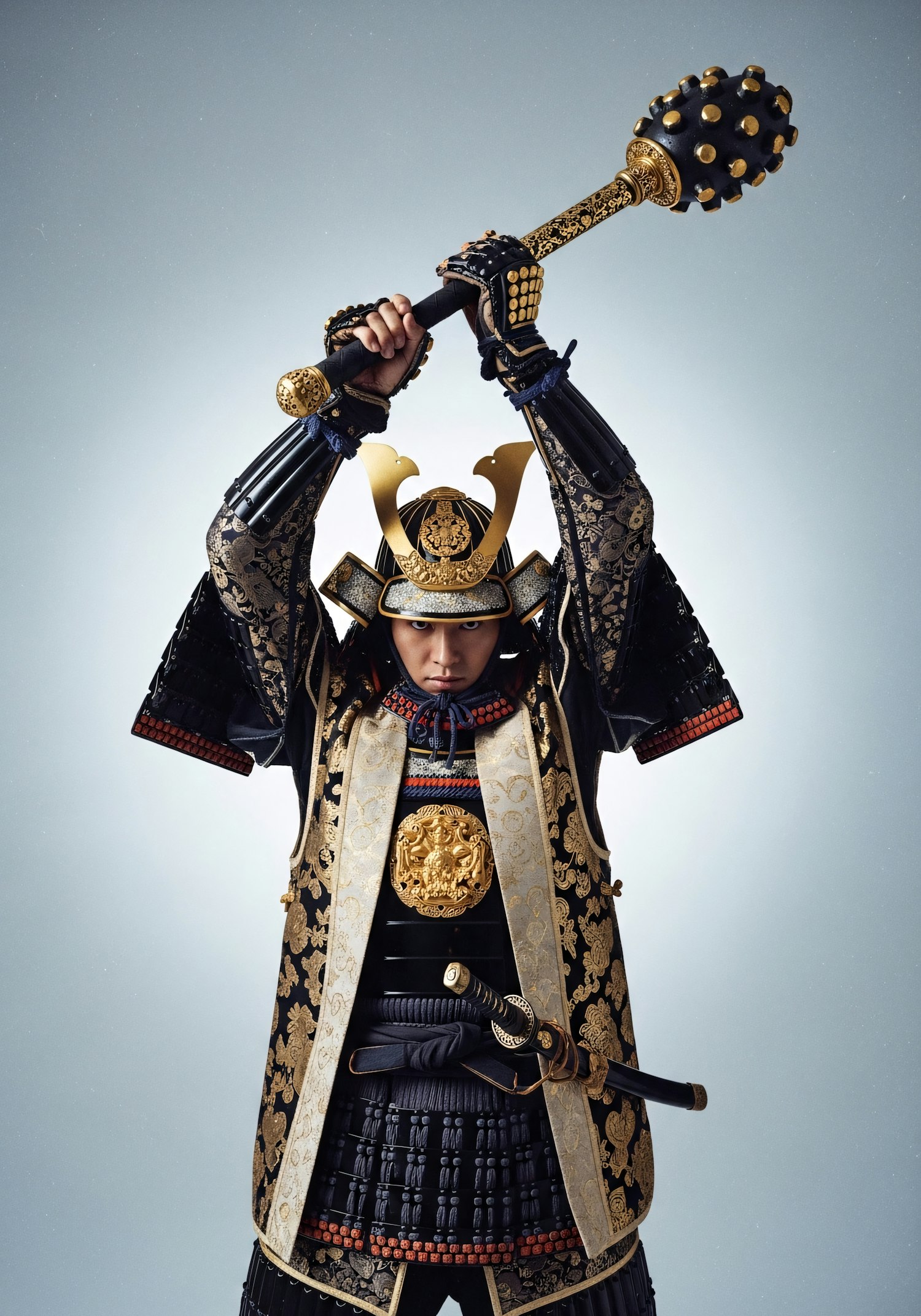 A samurai in ornate traditional armor holds a weapon aloft, showcasing intricate gold and black designs against a neutral background.