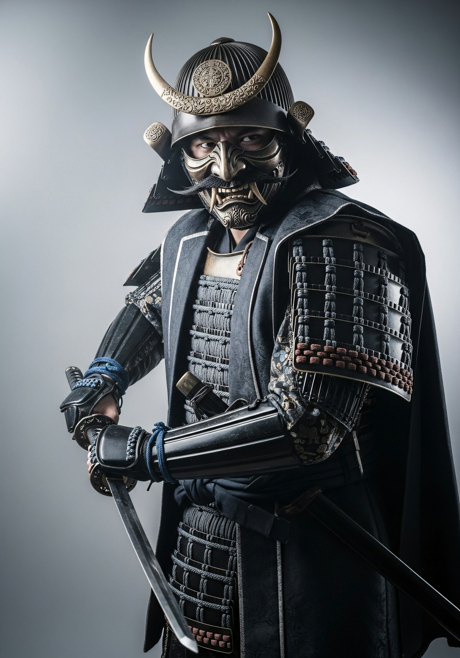 A samurai in traditional armor holding a katana, showcasing intricate details and a fierce expression against a neutral background.
