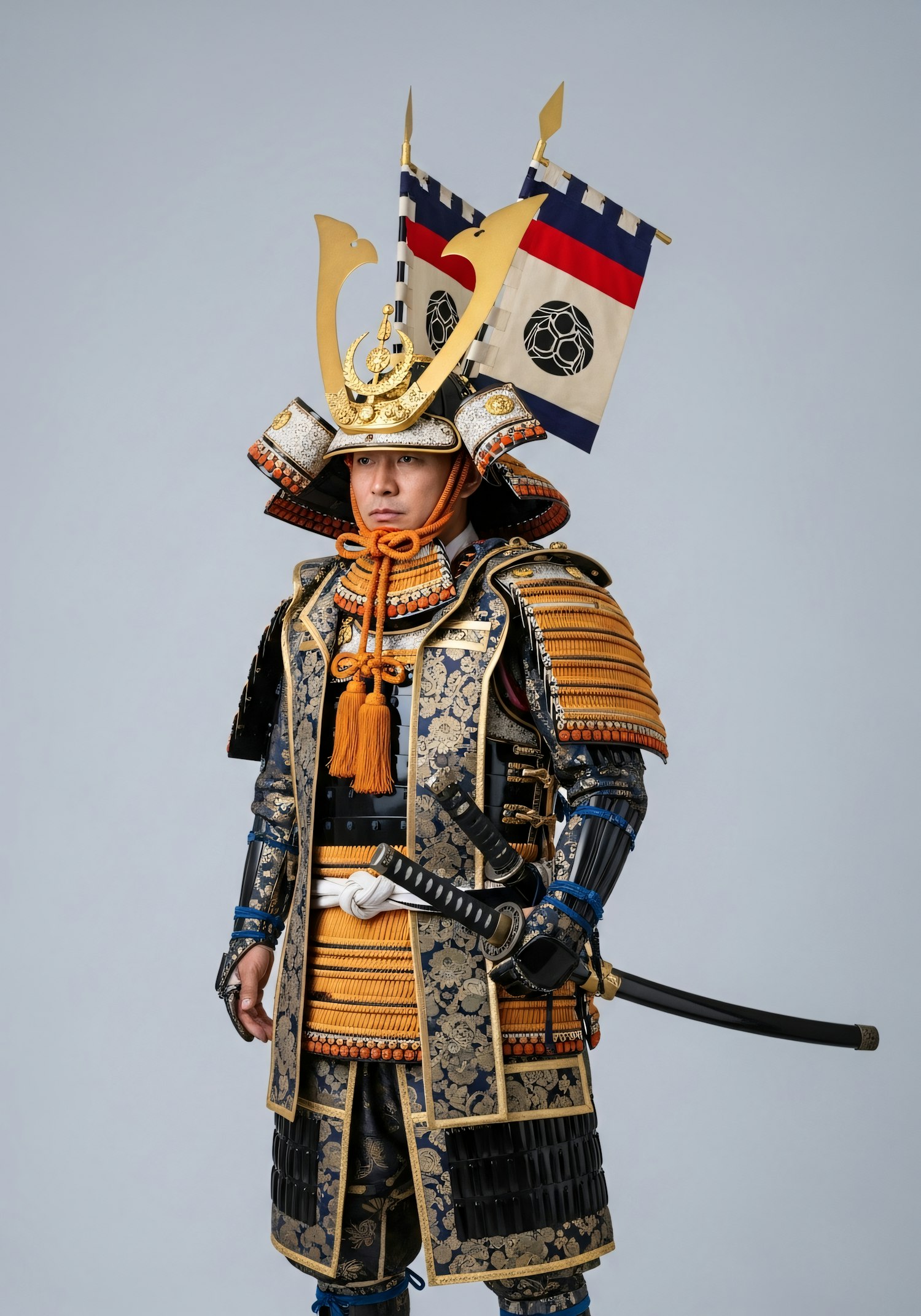 A person in traditional Japanese samurai armor with intricate details and vibrant colors, holding a katana against a plain background.
