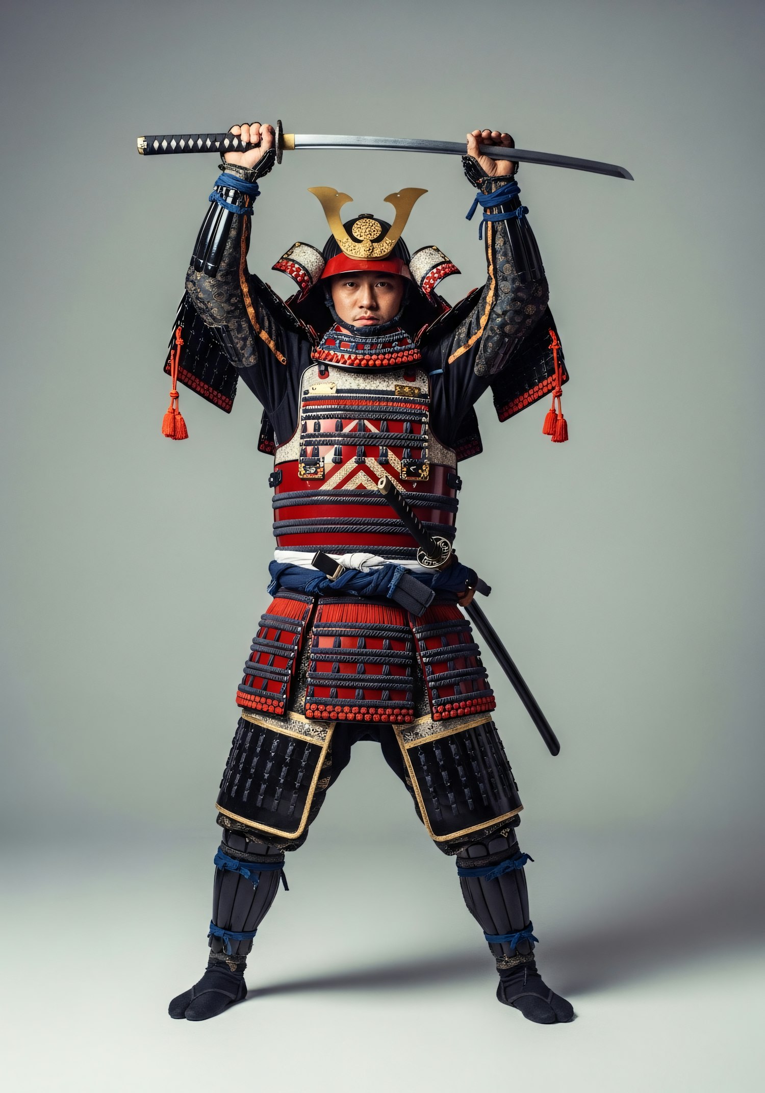 A person in traditional samurai armor holding a katana above their head, showcasing intricate details and a powerful stance.
